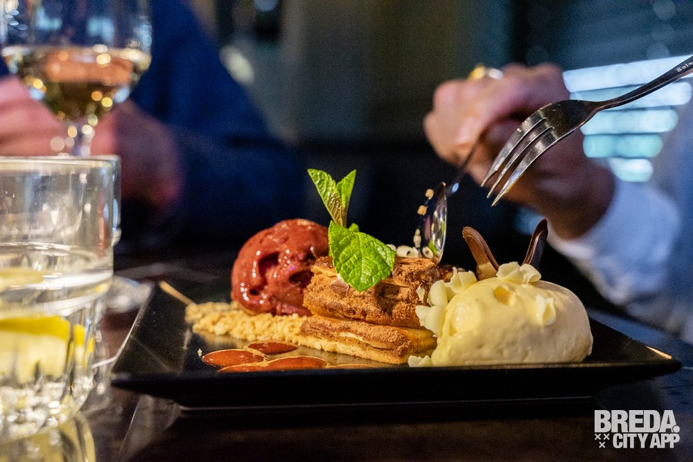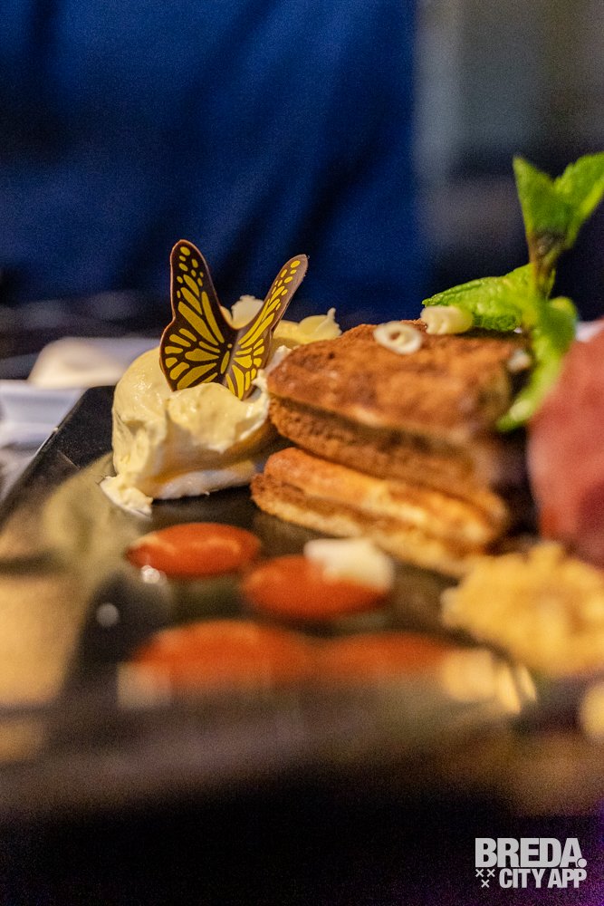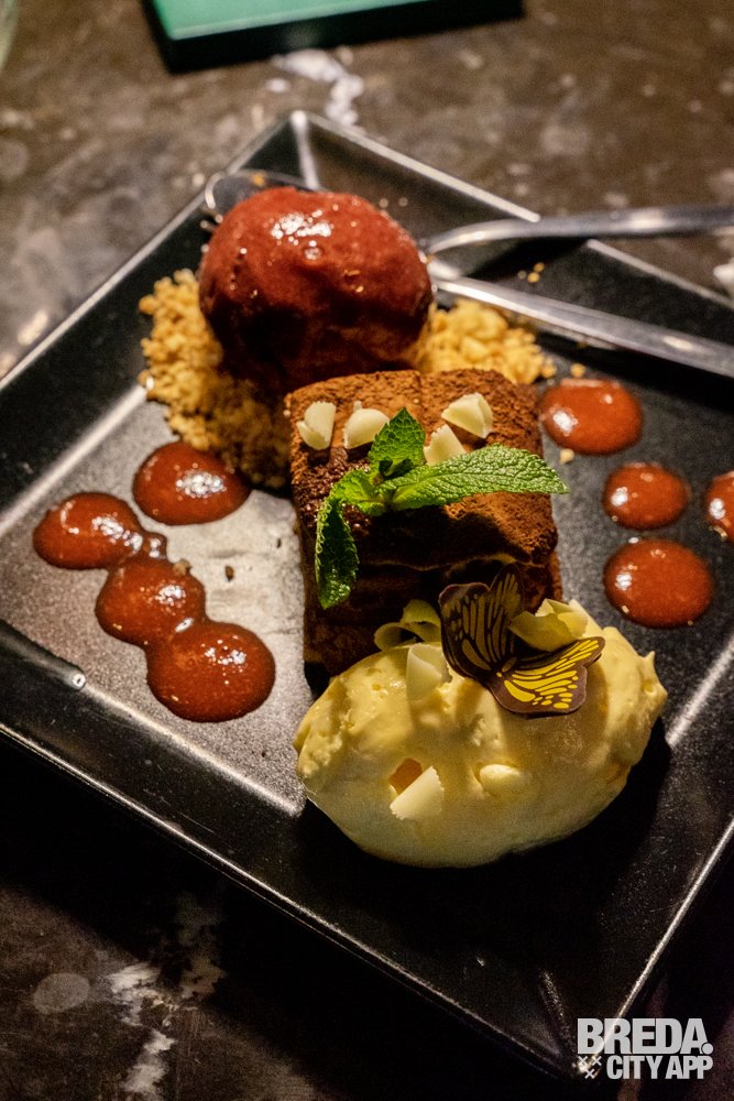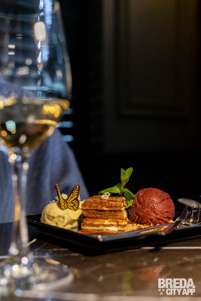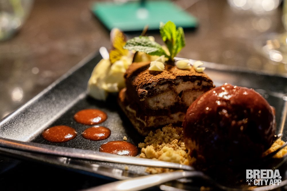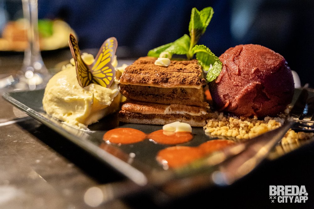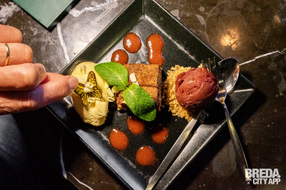Het dessert is een tiramisu geserveerd met advocaat room en een bol bosbessen sorbetijs. Erg leuk opgemaakt met witte chocoladekrullen en de chocoladevlinder als finishing touch. Het dessert is niet te zwaar, en de fris-zoete smaak van het sorbetijs zorgt voor een mooie balans met de romige tonen van de tiramisu en de advocaat. We blijven hierbij een heerlijke Merlot drinken, maar je kunt uiteraard ook een lekker kopje koffie of thee nemen.