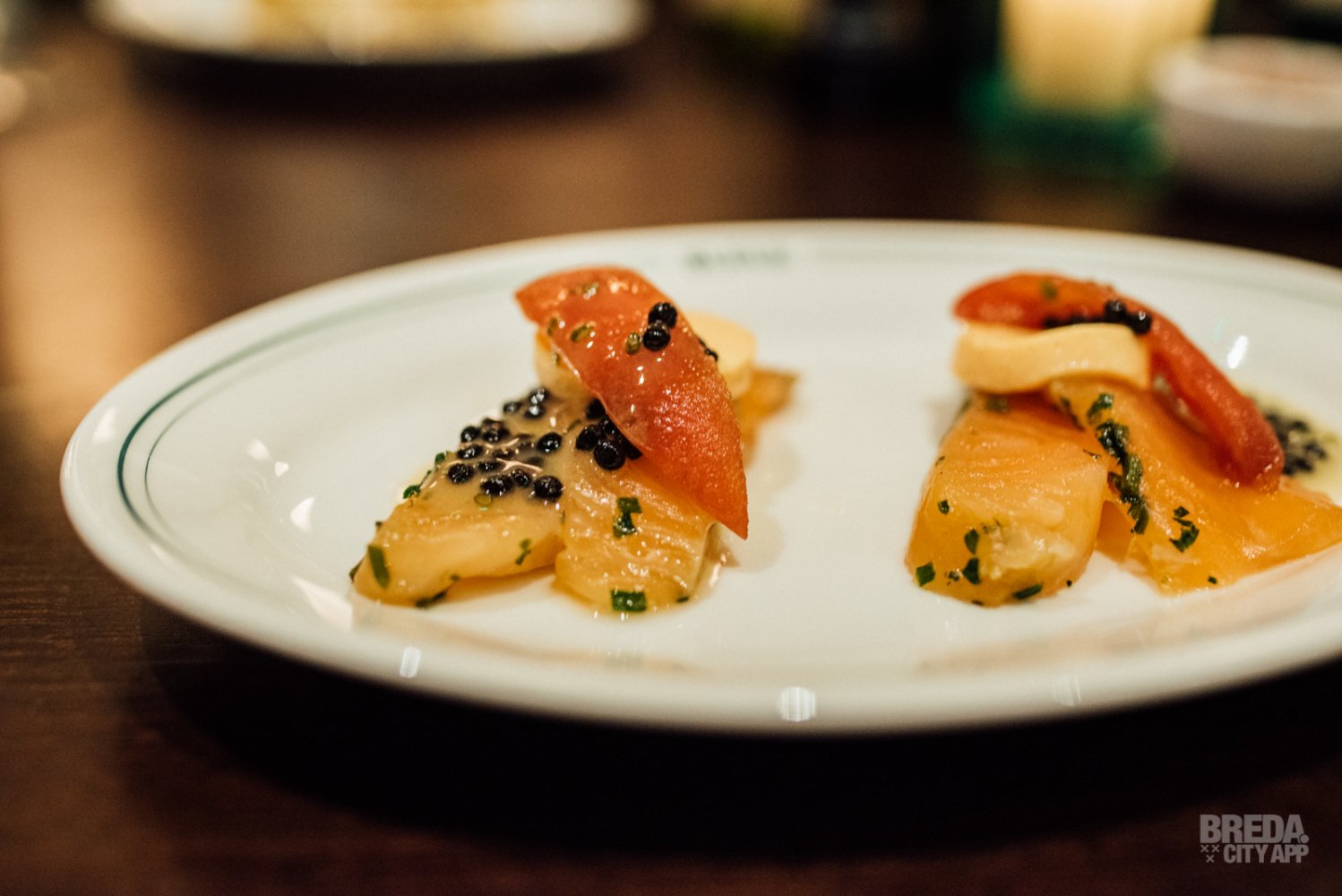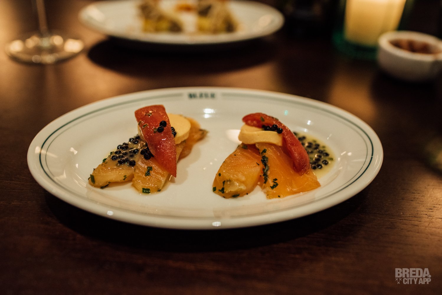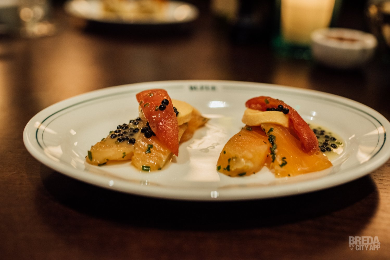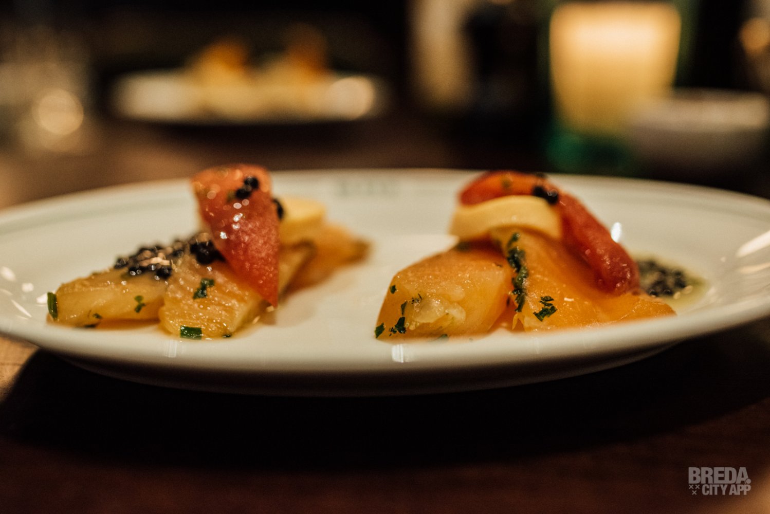 We beginnen met het visgerecht; gravad lax. De gemarineerde zalm wordt geserveerd met een flan van tomaat, umami tomaat en haringkuit. Een klassiek gerecht in een modern jasje, met een een heerlijke combinatie van diverse smaken en structuren!