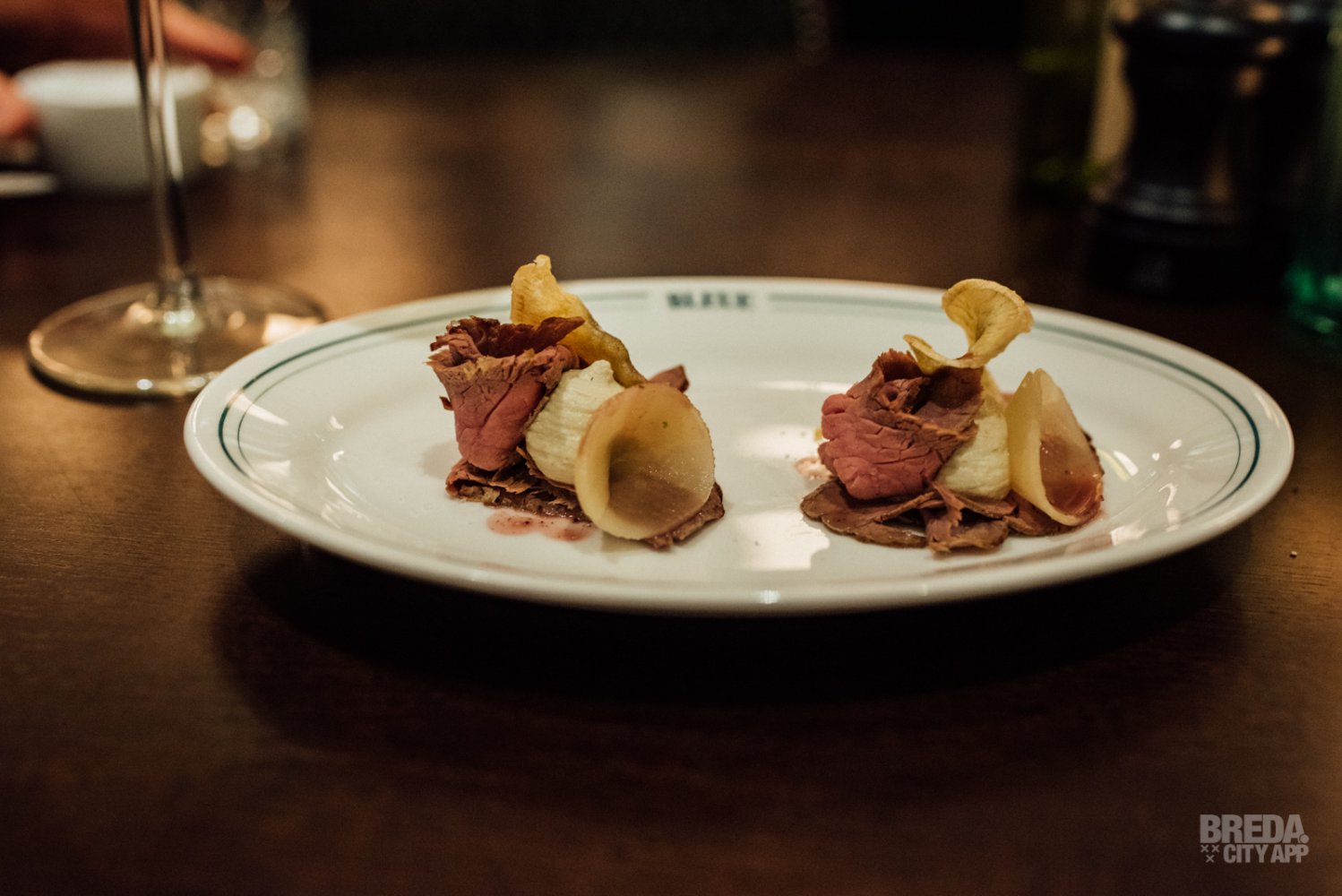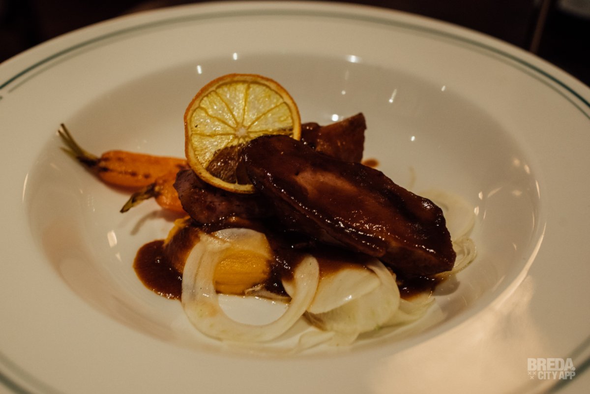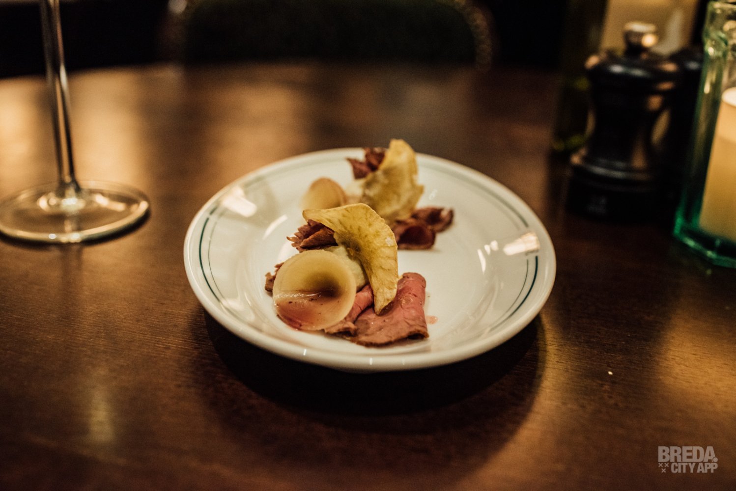 De rosbief met vinaigrette van truffel en rode port wordt geserveerd met crème van artisjok. Artisjok is tevens gebruikt voor het krokantje dat geserveerd wordt bij dit gerecht. Verschillende structuren en de mooie en pure ingrediënten vormen een smaakvol geheel. Het keukenteam heeft ons hiermee enorm weten te enthousiasmeren en we weten nu al dat we hier snel weer terug komen voor meer!