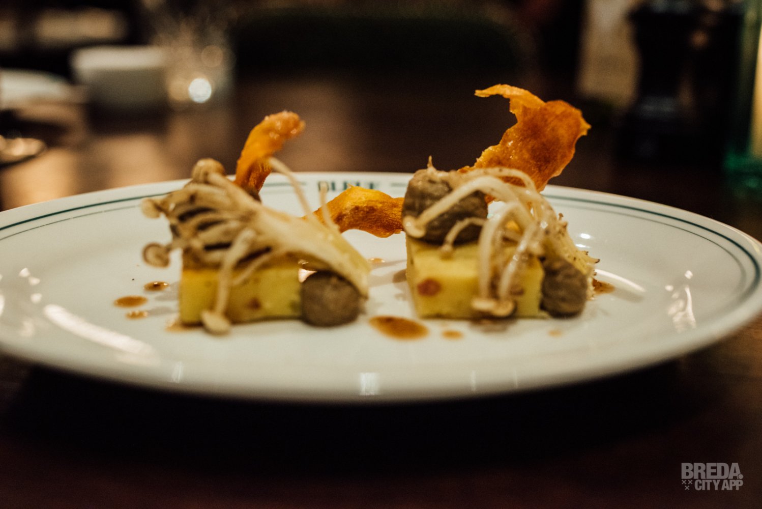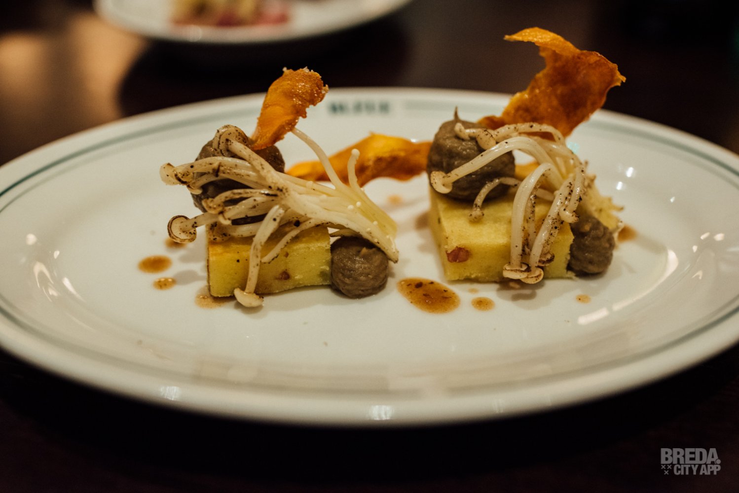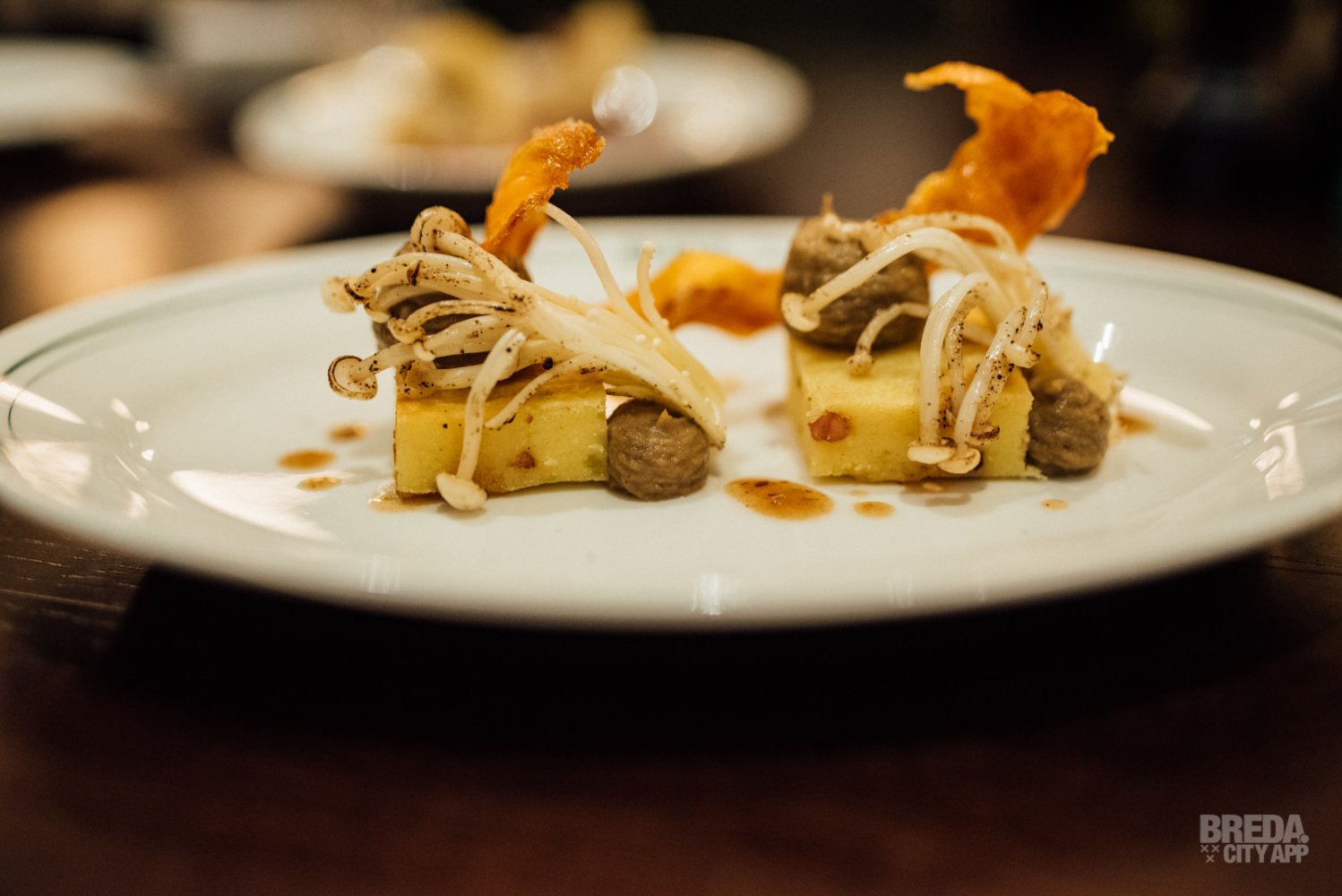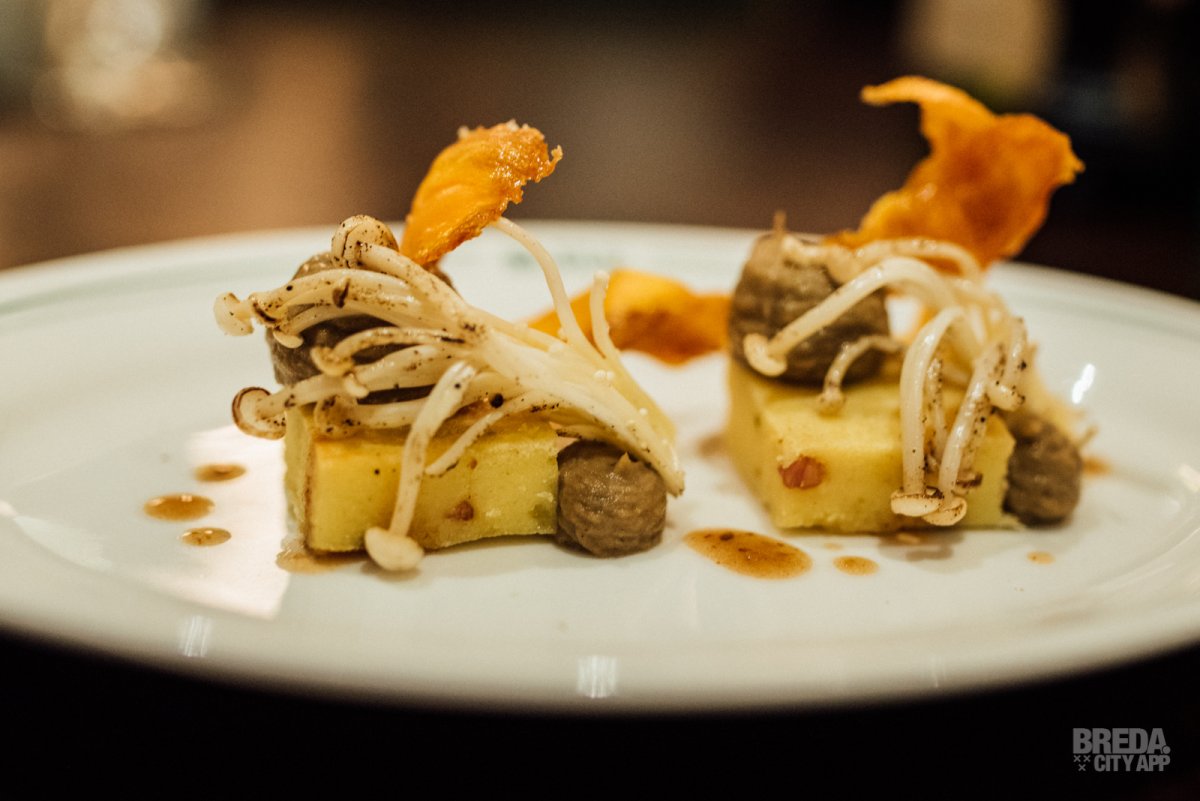 We proeven een aardappelmuffin met crème van gepofte aubergine en enoki paddenstoel. Dit gerecht is echt een kunstwerkje op een bord. De vinaigrette van zwarte bonen en een krokantje van wortel maken het vegetarische gerecht helemaal af.