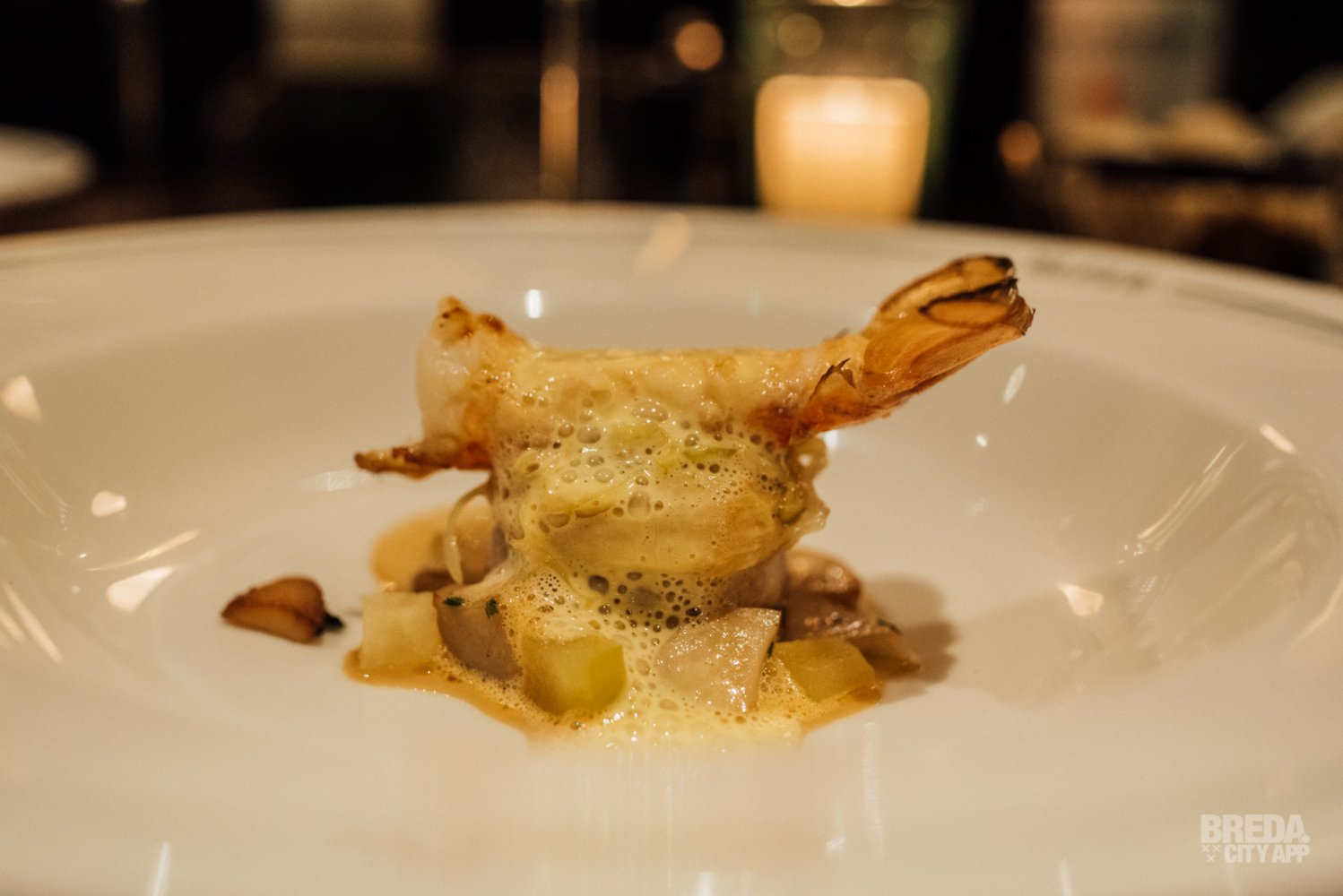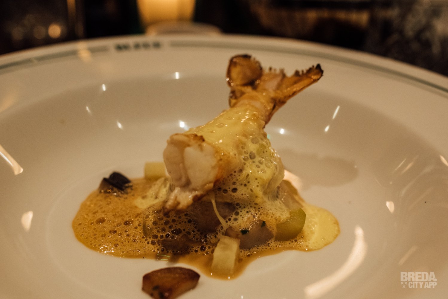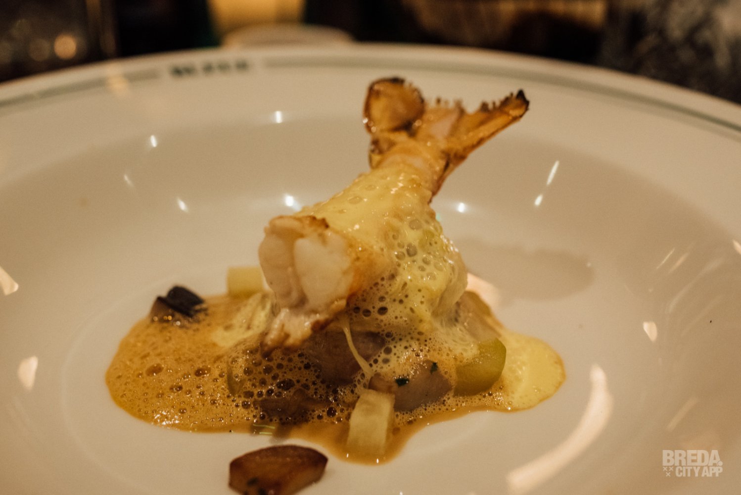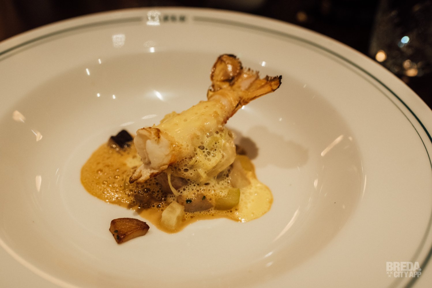 Naast ons zit een frans gezelschap gezellig te kletsen. Aan de andere kant zit een stel romantisch te genieten van het diner. Terwijl ons tussengerecht arriveert hebben we echt het gevoel dat we op vakantie in Frankrijk zijn! De rouleaux van hoender met langoustine wordt geserveerd met pastinaak, gekonfijte appel en Bearnaisesaus. Wat een plaatje en wat een smaken!