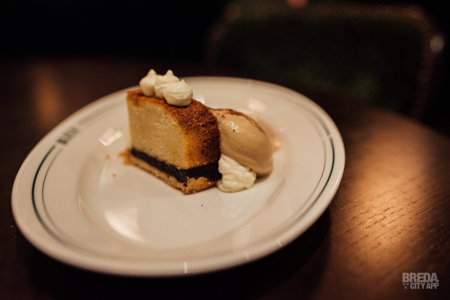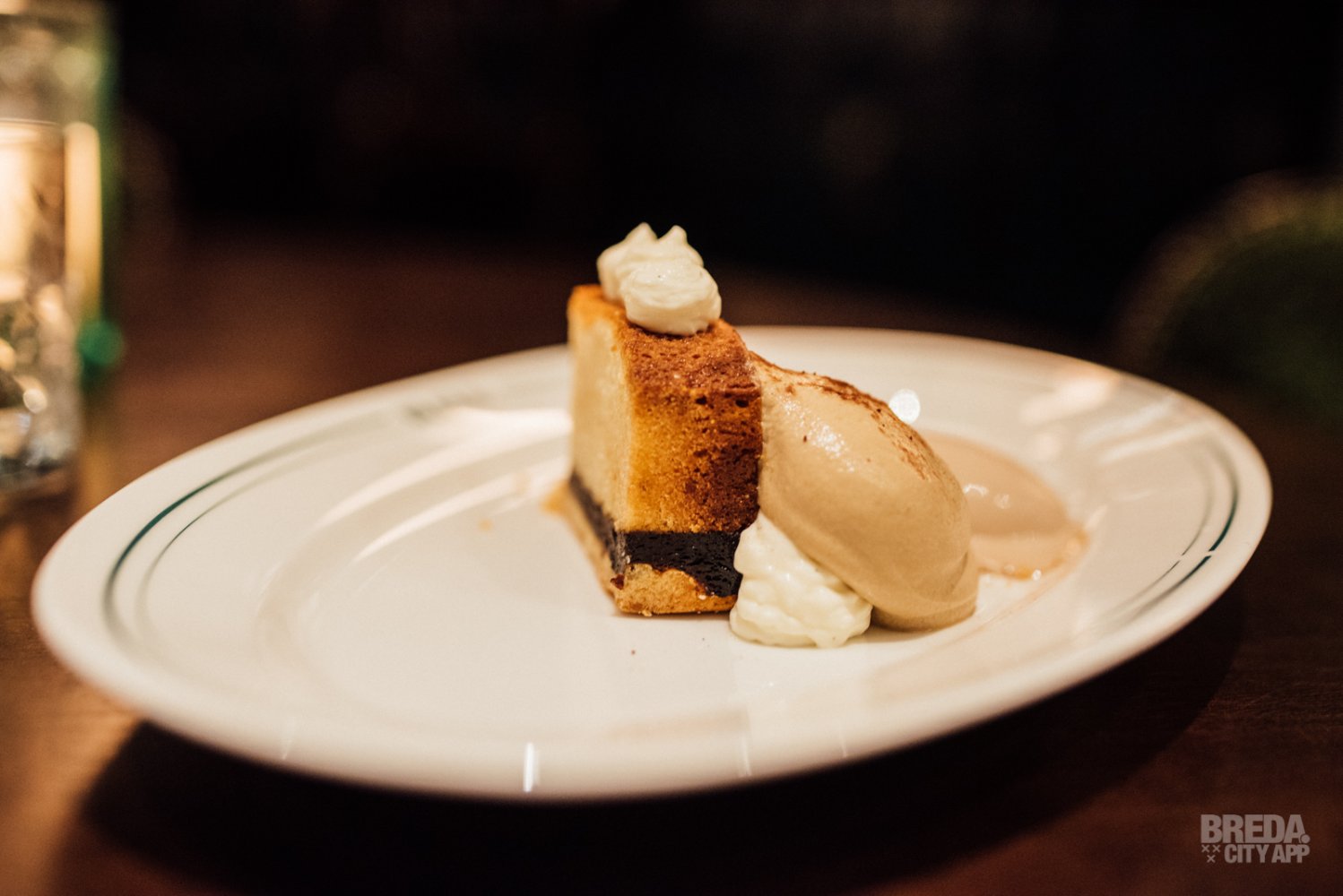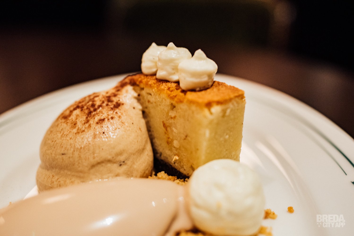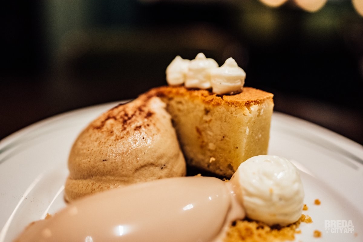Het dessert bestaat uit een typisch Frans amandelgebak met pruimen; financier. Hierbij wordt sabayon van espresso en roomijs van Nutella geserveerd. Wat een traktatie! De combinatie van cake, ijs, mascarpone en crumble zijn voortreffelijk.