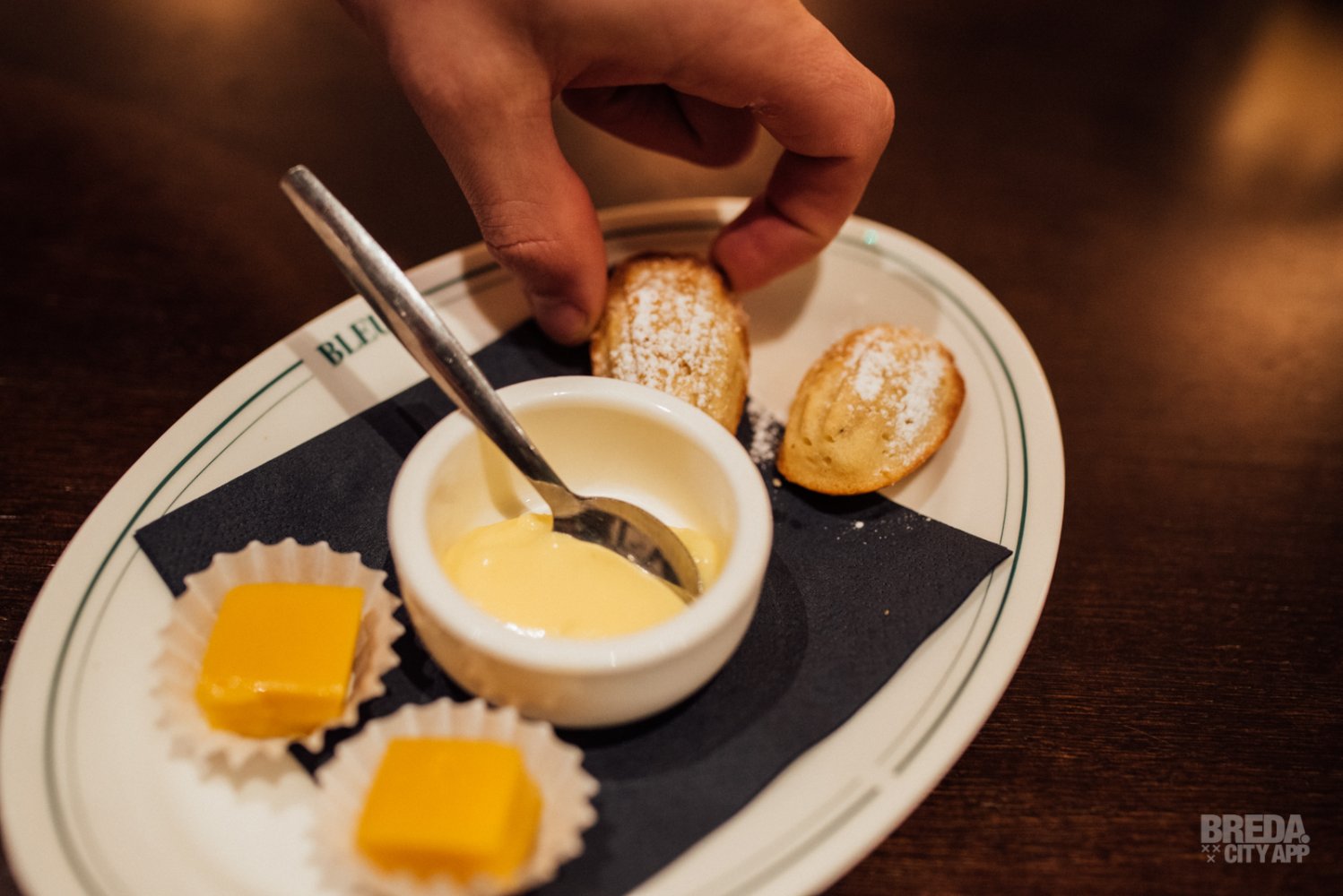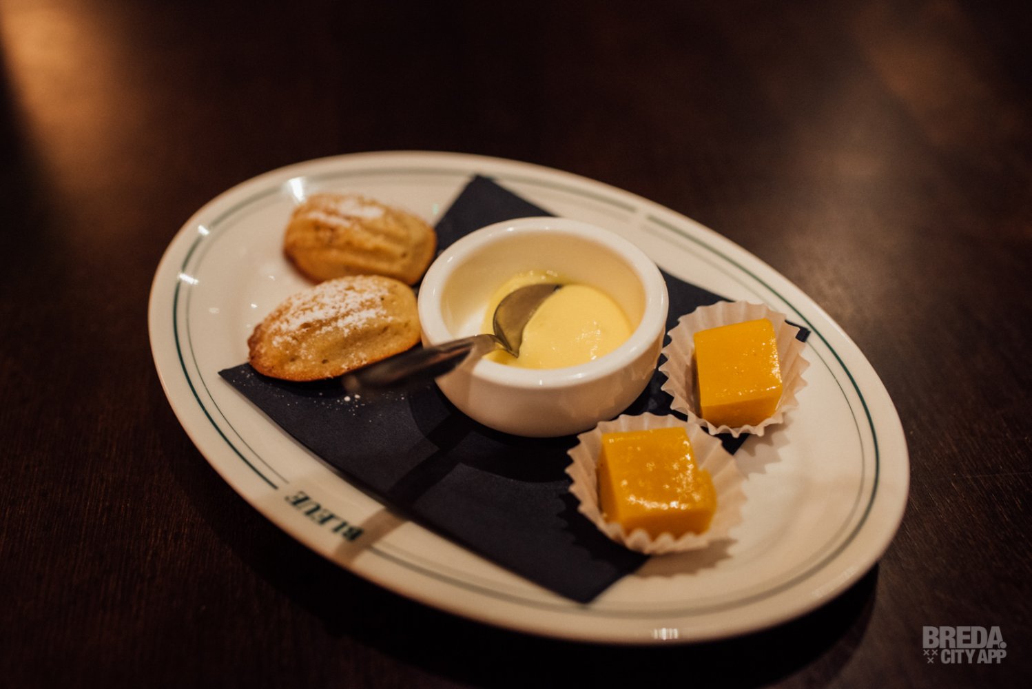 We sluiten de avond geheel in stijl af en krijgen Madeleines, lemon curd en panna cotta van mango bij de koffie. Gastvrouw Fleur en team Bleue hebben al onze verwachtingen overtroffen. Wat een gezellige zaak en wat een fantastische wijnspijs combinaties!