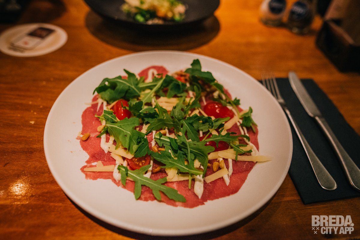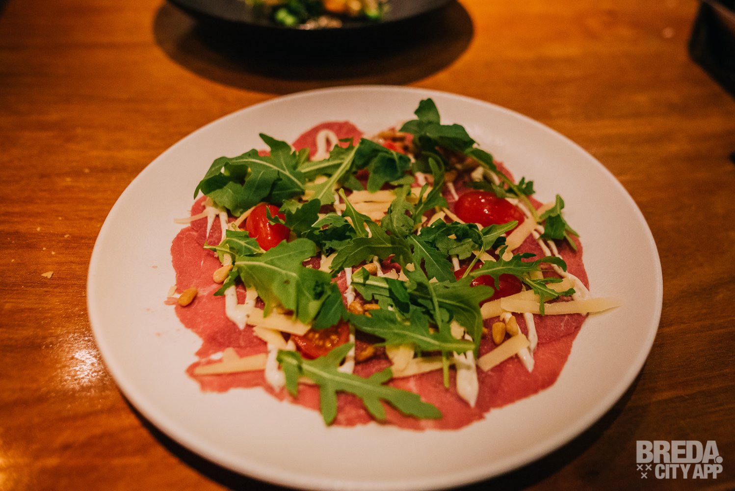 De carpaccio is een echte klassieker die altijd goed in de smaak valt! Deze wordt geserveerd met truffelmayonaise, parmezaanse kaas, geroosterde pijnboompitjes, zoete tomaatjes en knapperige rucola.
