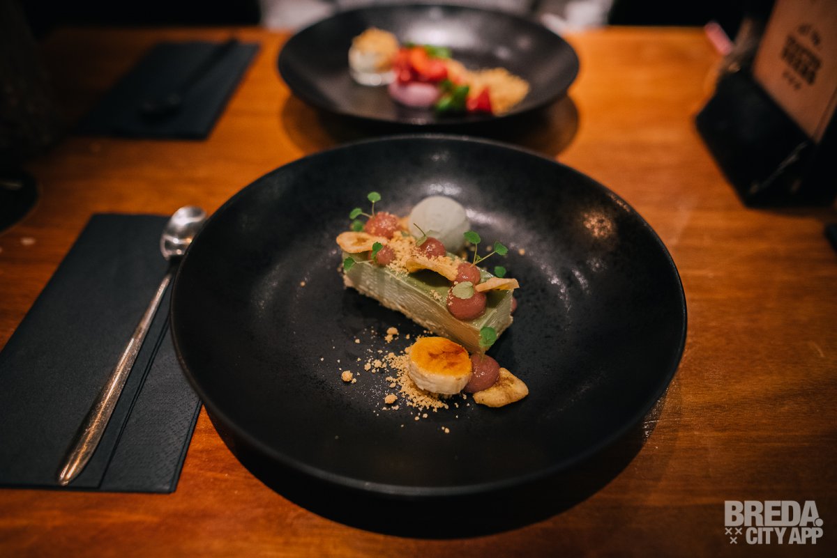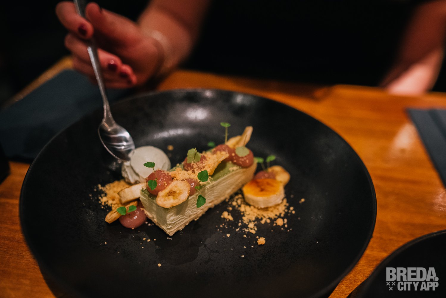The kingfisher bestaat uit een zachte pudding met een cake bodem. Zoals het eruit ziet, zo smaakt het ook! De pistache smaken overheersen en zijn heerlijk in combinatie met de zoete gel van perzik. De garnering bestaat uit een krokantje, een bolletje pistache ijs en gekarameliseerde banaan. Het is de perfecte afsluiting van een heerlijk diner.