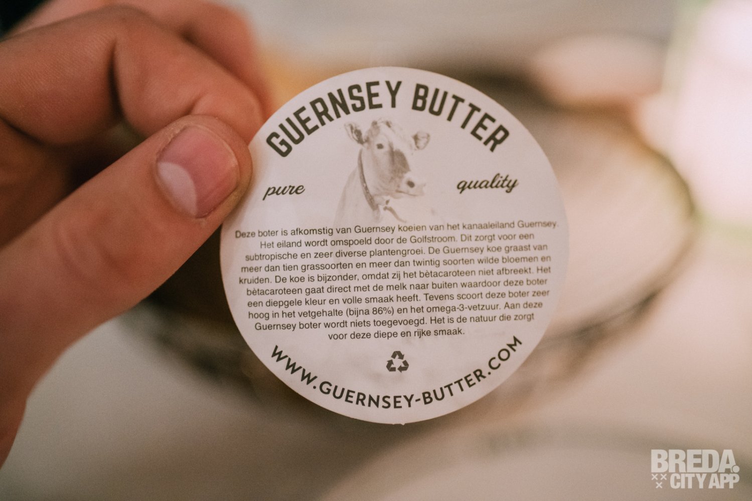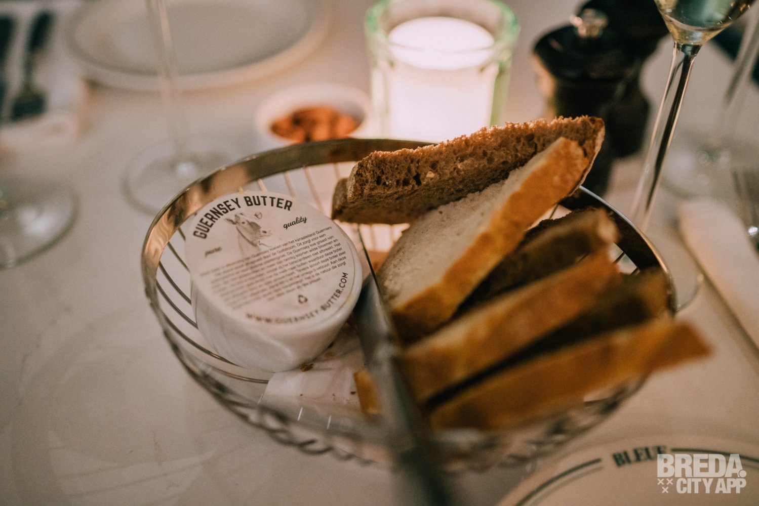 We starten met een mandje brood en heerlijke Guernsey boter. De gelijknamige koeien grazen meer dan tien grassoorten en meer dan twintig wilde bloemen. De koe is bijzonder, omdat zij het bètacaroteen niet afbreekt. Dit gaat direct met de melk naar buiten waardoor deze boter een diep gele kleur en volle smaak heeft.
