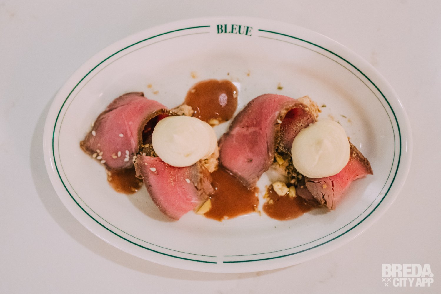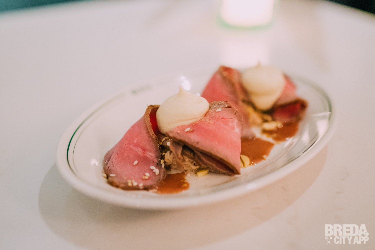 De vitello tonato wordt geserveerd met een knolcrème, appel-rode port saus, stukjes pinda en sesampitjes. Het vlees is mooi gegaard en wordt in een krul op het bord geserveerd. Een echte klassieker, maar dan met een eigen twist.