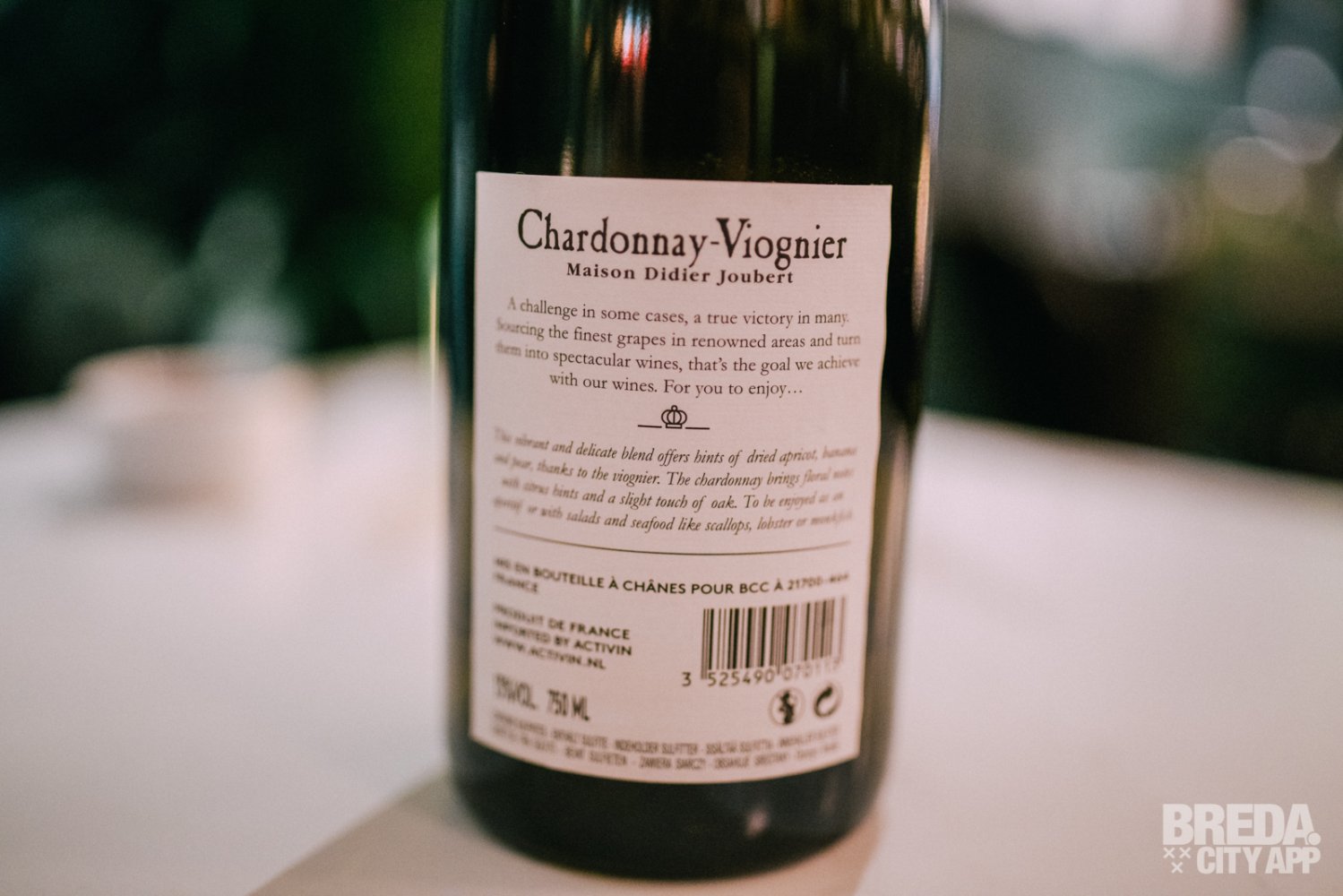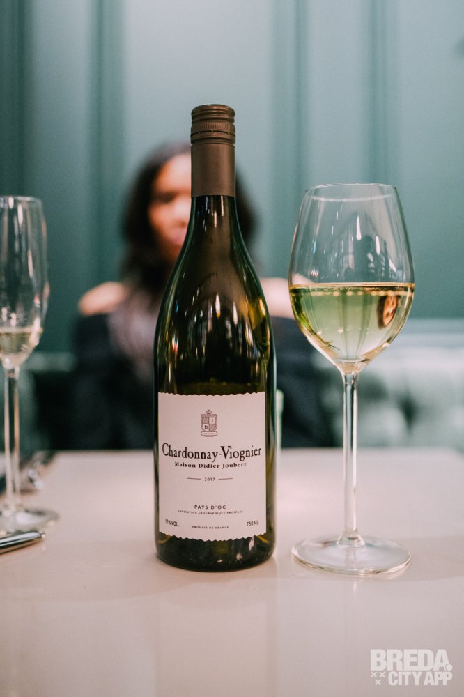 We drinken bij onze voorgerechten een glas wit van Maison Didier Joubert, een Chardonnay Viognier. De eerste indruk is een bloemige neus dankzij de Viognier. In de smaak wordt dit aangevuld door een frisse doch romige toevoeging van de chardonnay. Tonen van rijpe meloen, amandel en peer maken deze wijn zeer aangenaam.