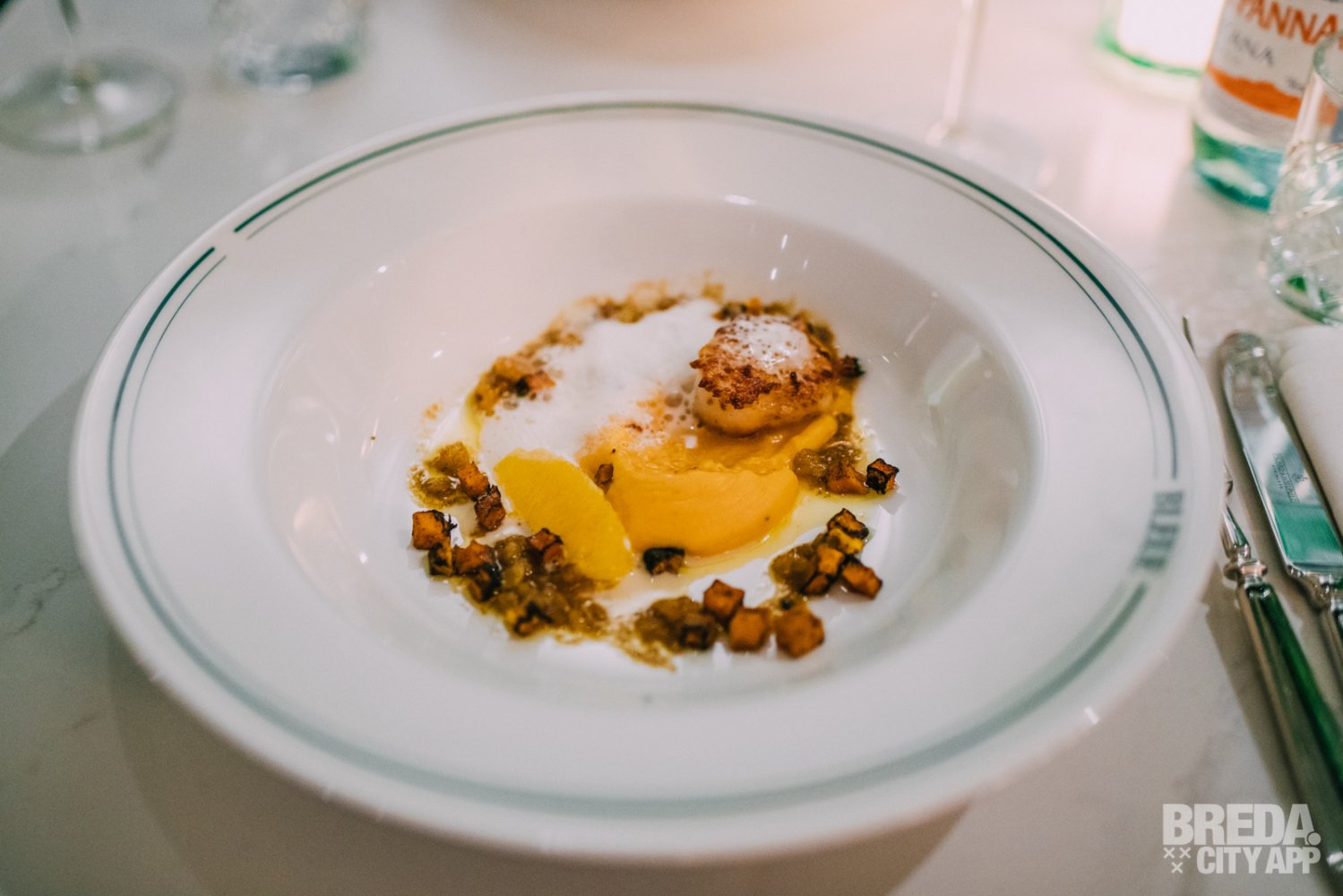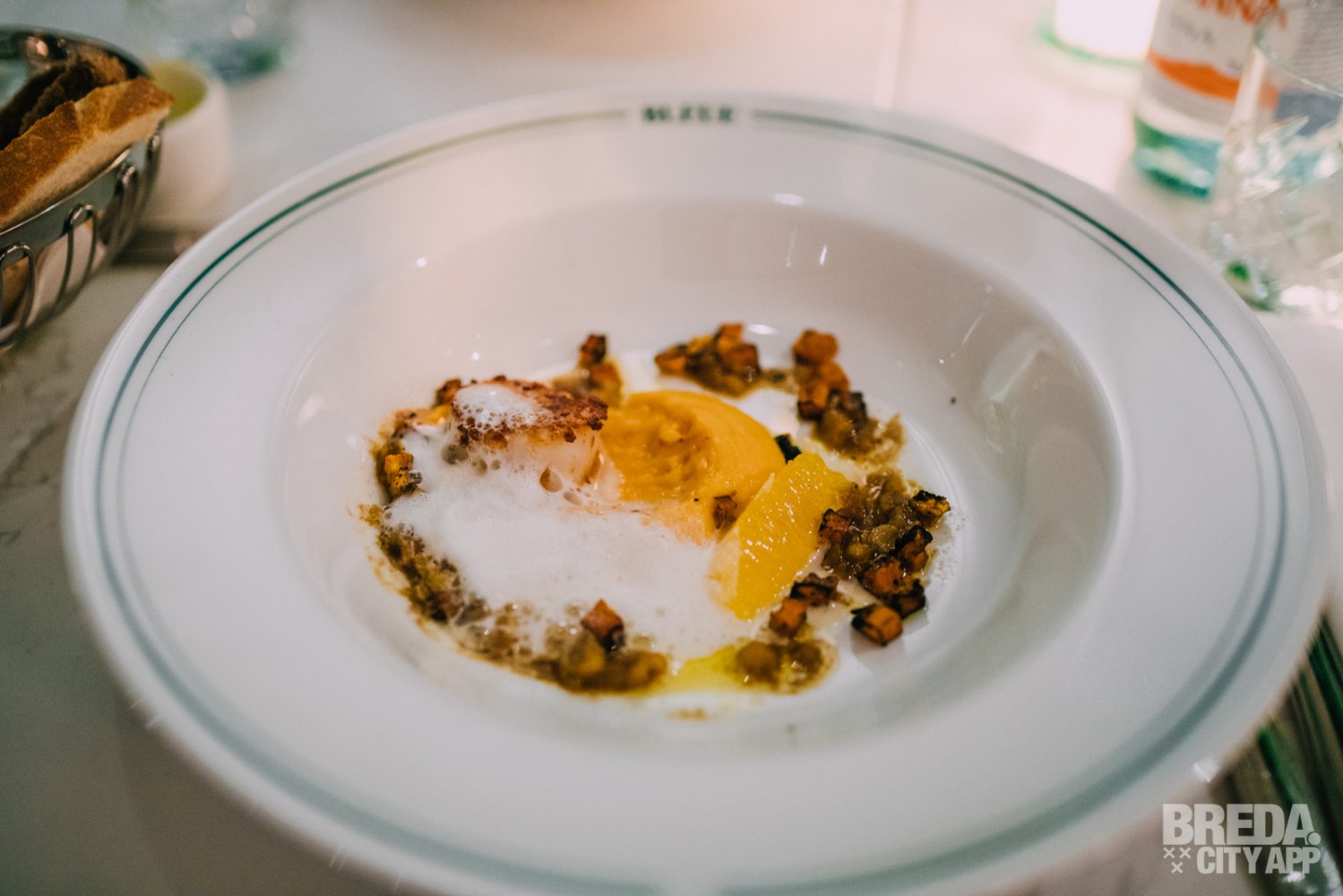 Als tussengerechten krijgen we coquilles, geserveerd met gegrilde pompoen, sereh saus, sinaasappel en een hazelnoot Vinaigrette. De coquilles zijn prachtig gegaard en gaan mooi samen met de volle en romige smaken. De vinaigrette is subtiel aanwezig en de sinaasappel zorgt voor een mooi zuurtje in het gerecht. Het krokantje van de gegrilde pompoen is de kers op de taart.