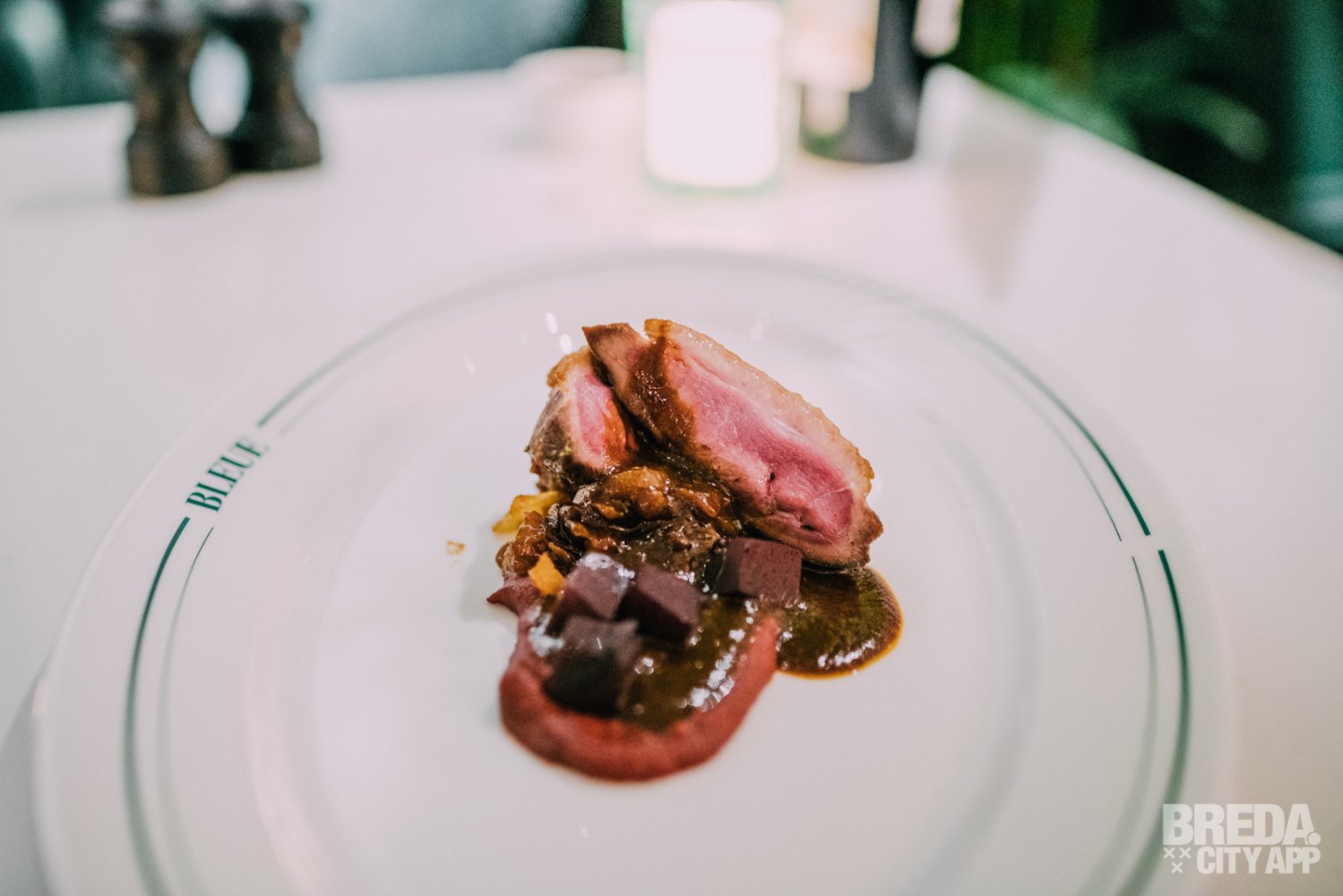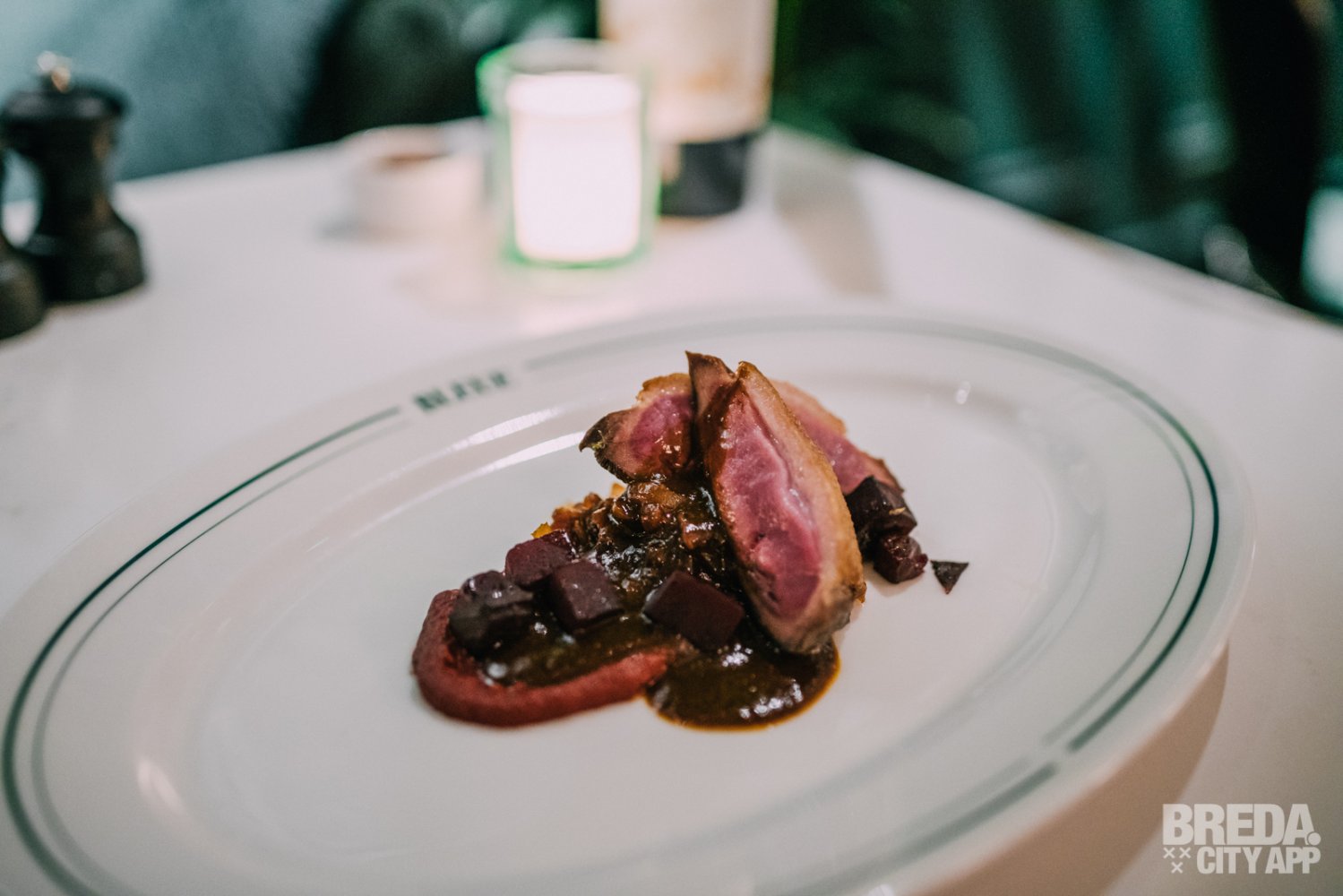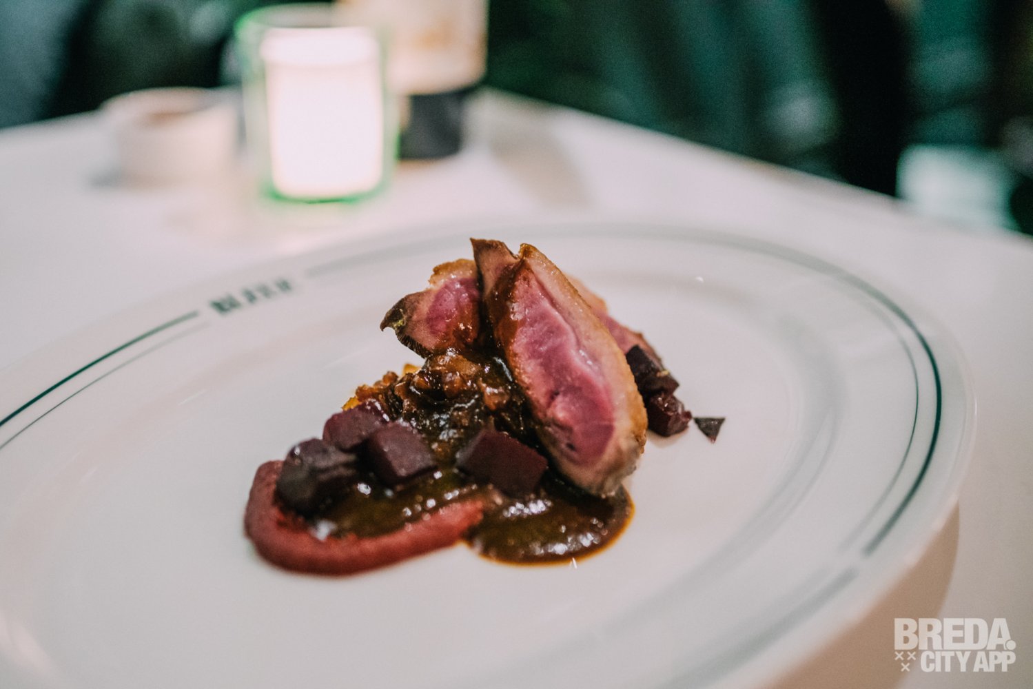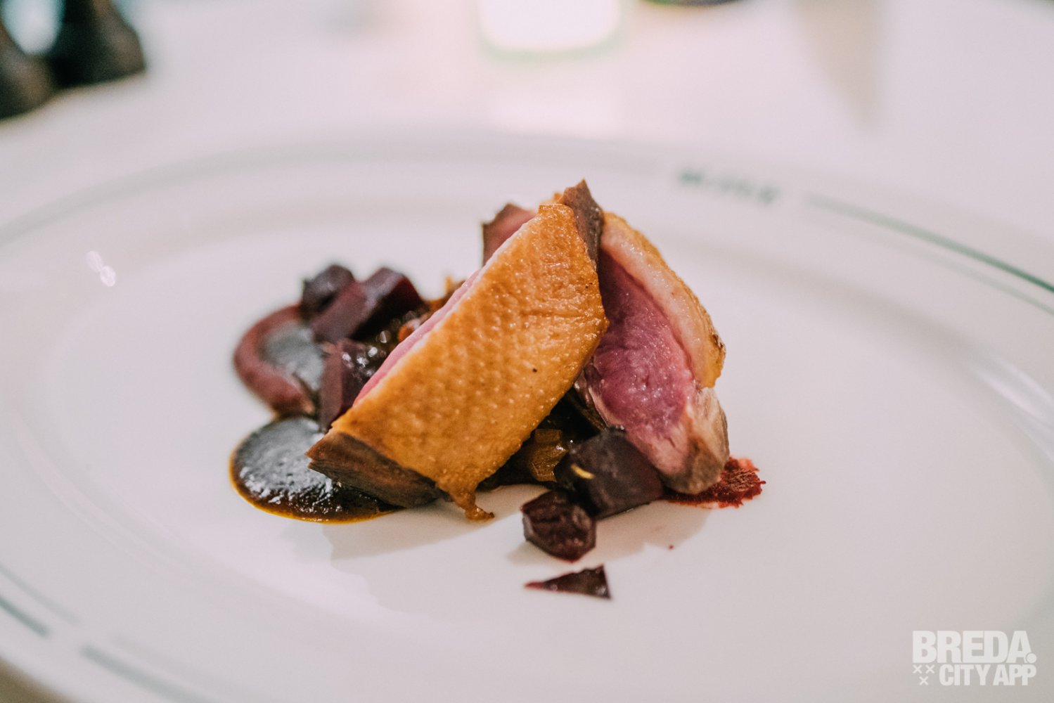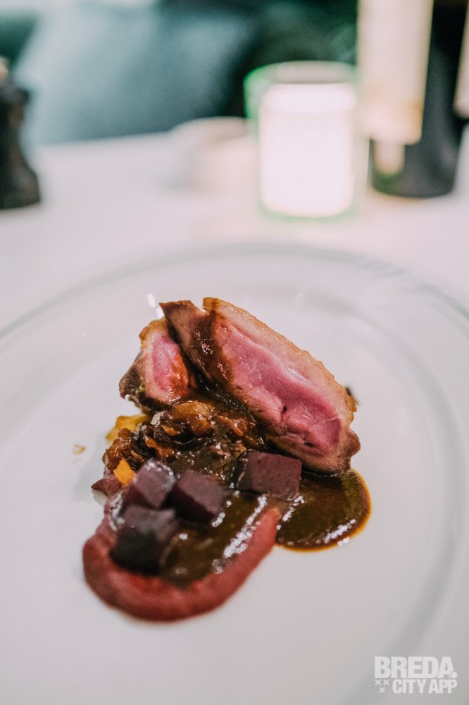 De boerderij eend wordt geserveerd met rode biet, abrikoos-kerrie en long pepper saus. De eend is op de huid eibakken en mooi gegaard. Het vlees is mals en heerlijk in combinatie met de aardse tonen van de rode biet.