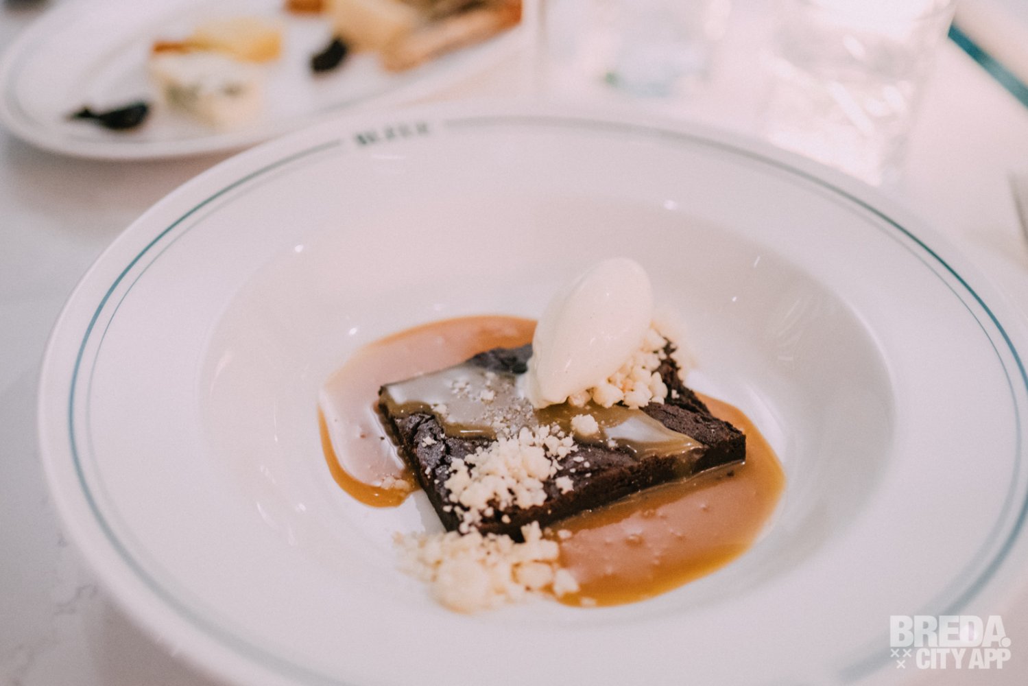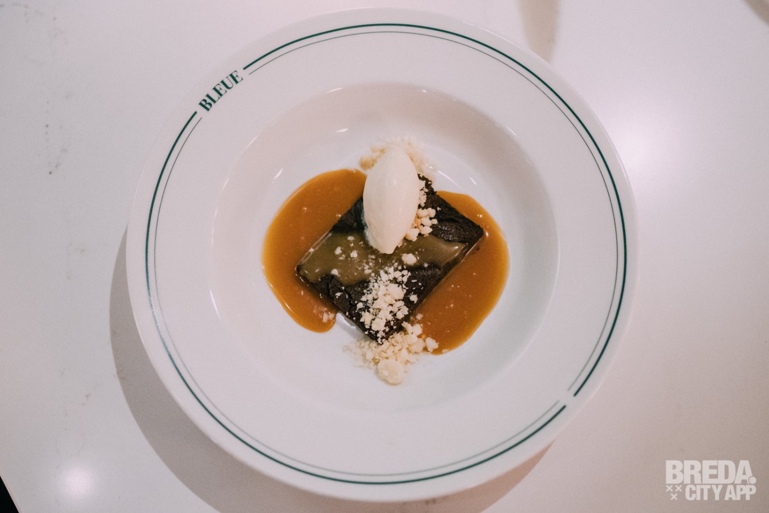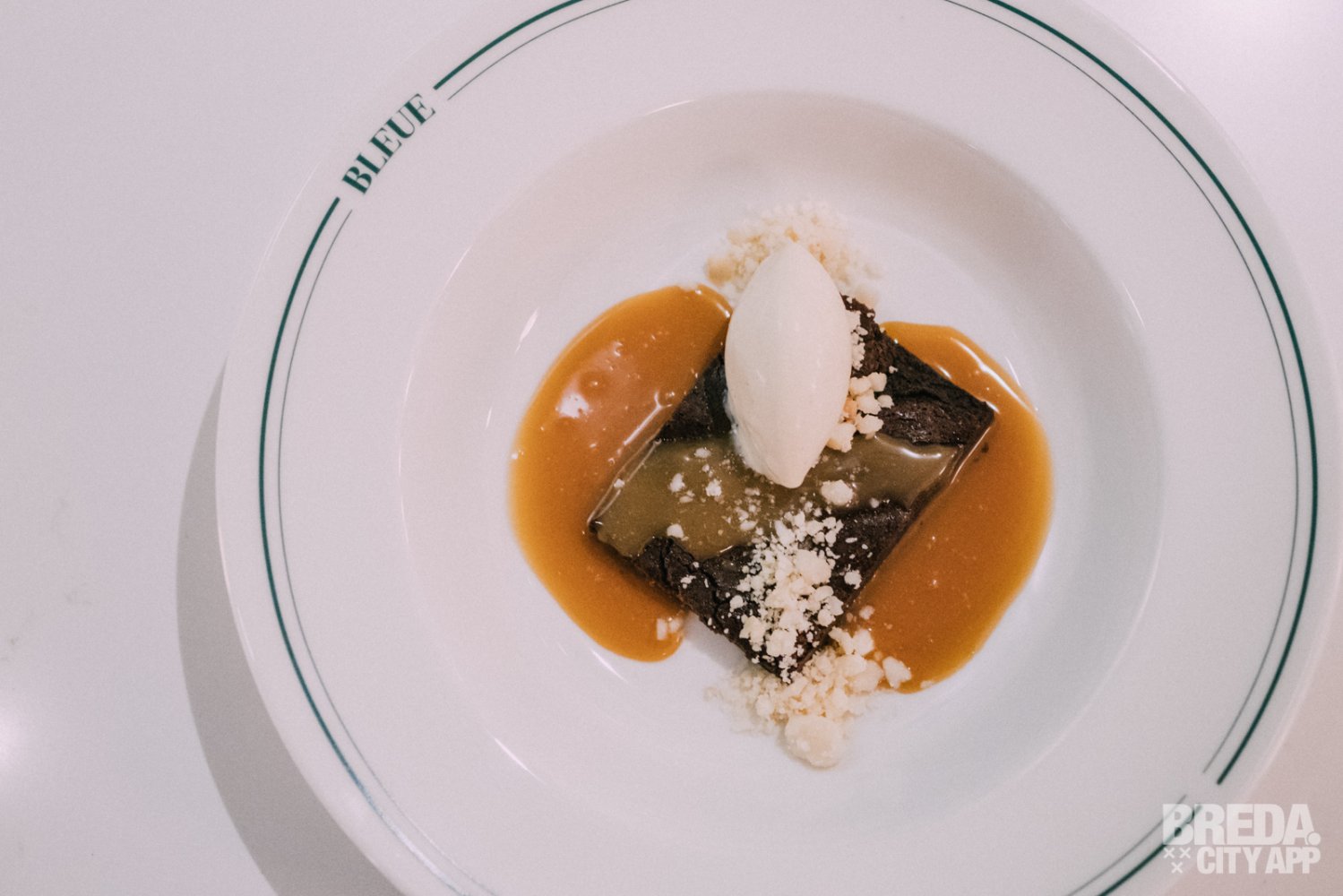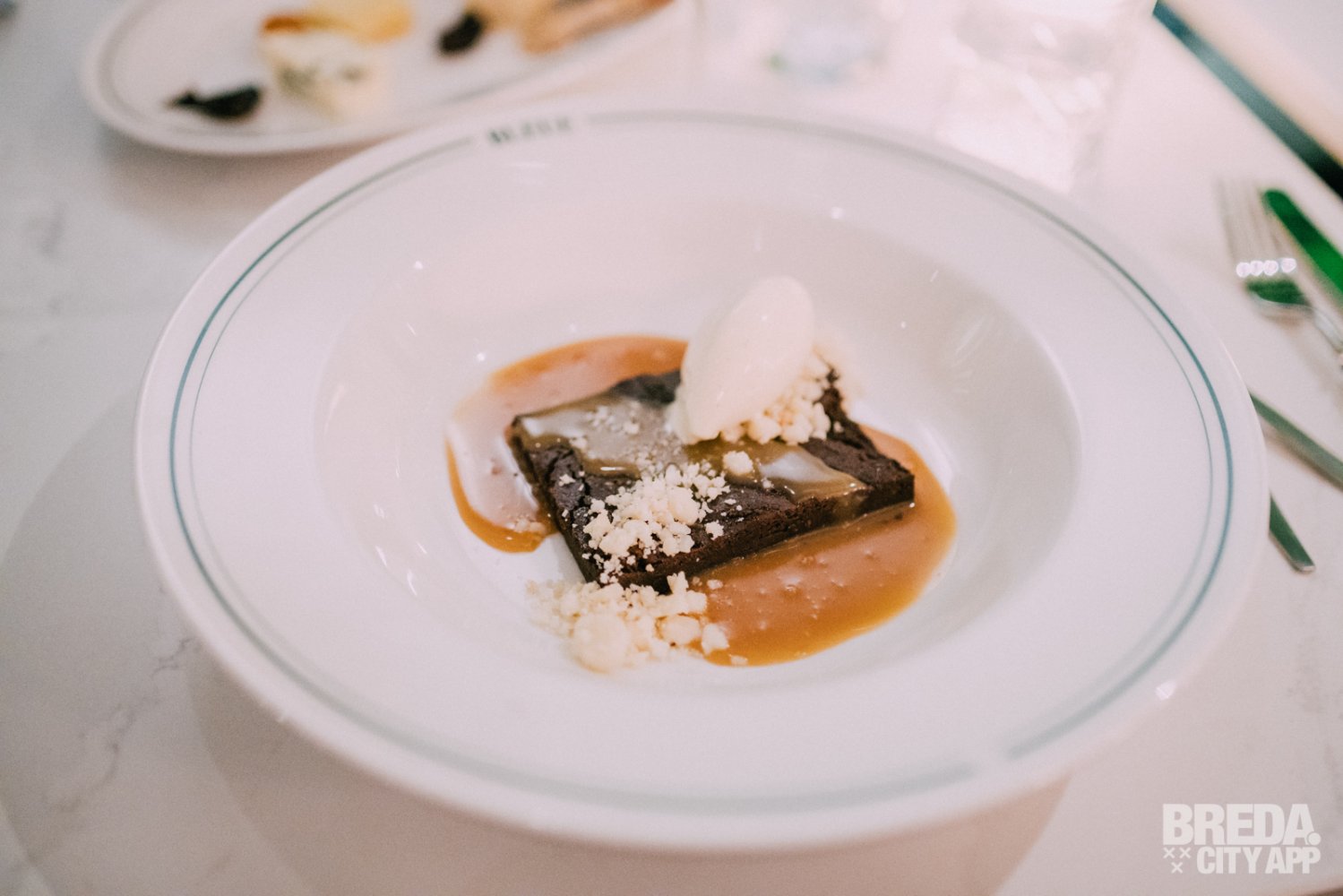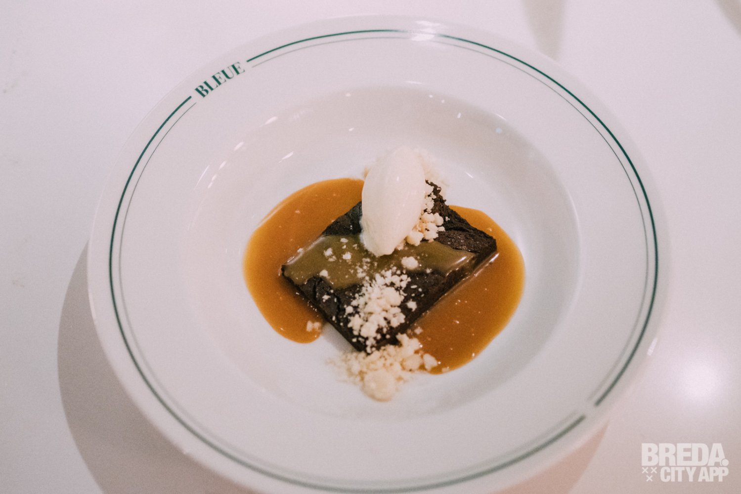 De chocolade brownie wordt geserveerd met caramelsaus, macadamianoten en banaan-limoen roomijs. De brownie is heerlijk, super smeuïg en gelukkig niet te zoet, waardoor de mooie pure en licht bittere smaak van de chocolade goed samengaat met de karamel. Het ijs is licht zuur met een subtiele smaak van banaan. Écht een heerlijk dessert!