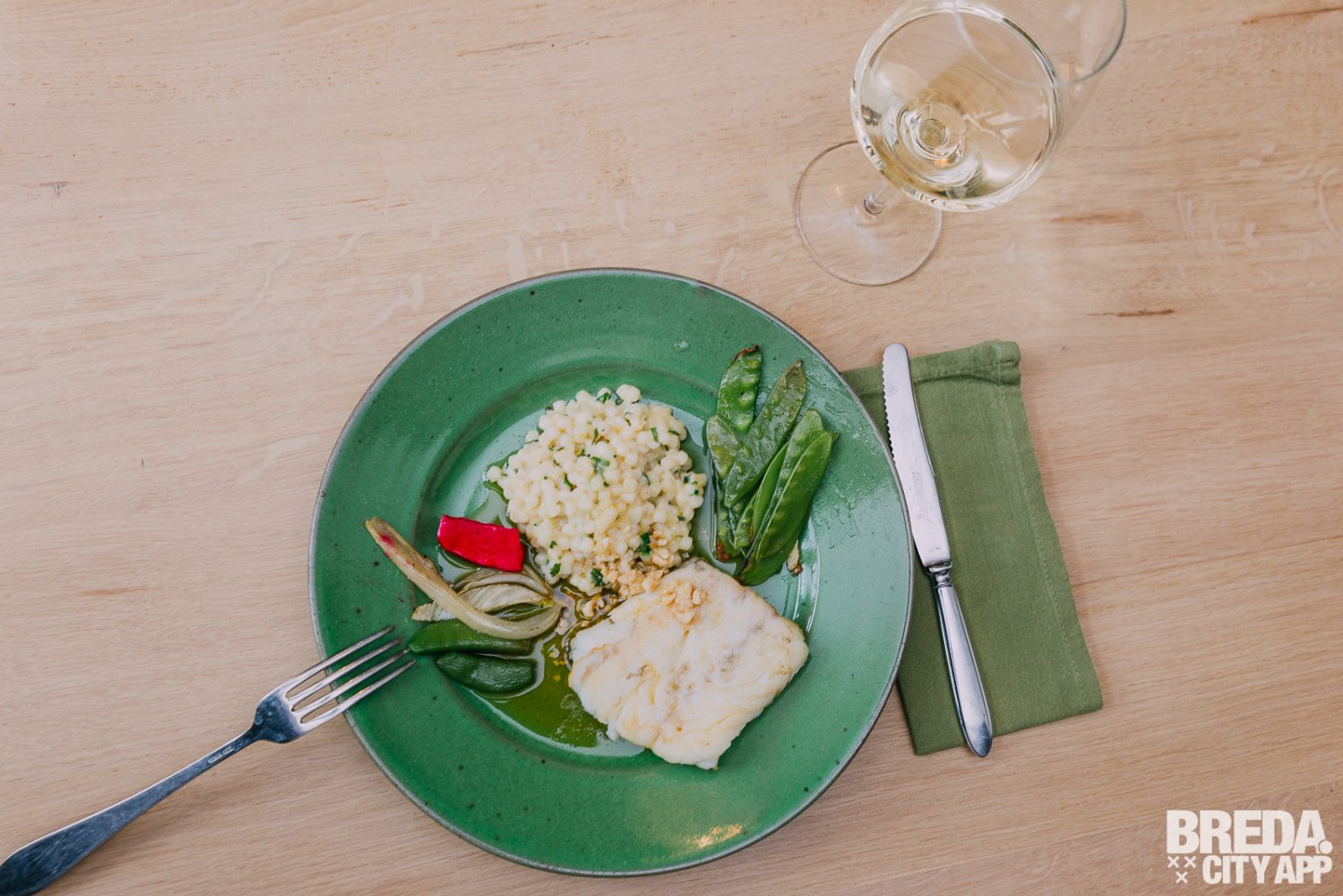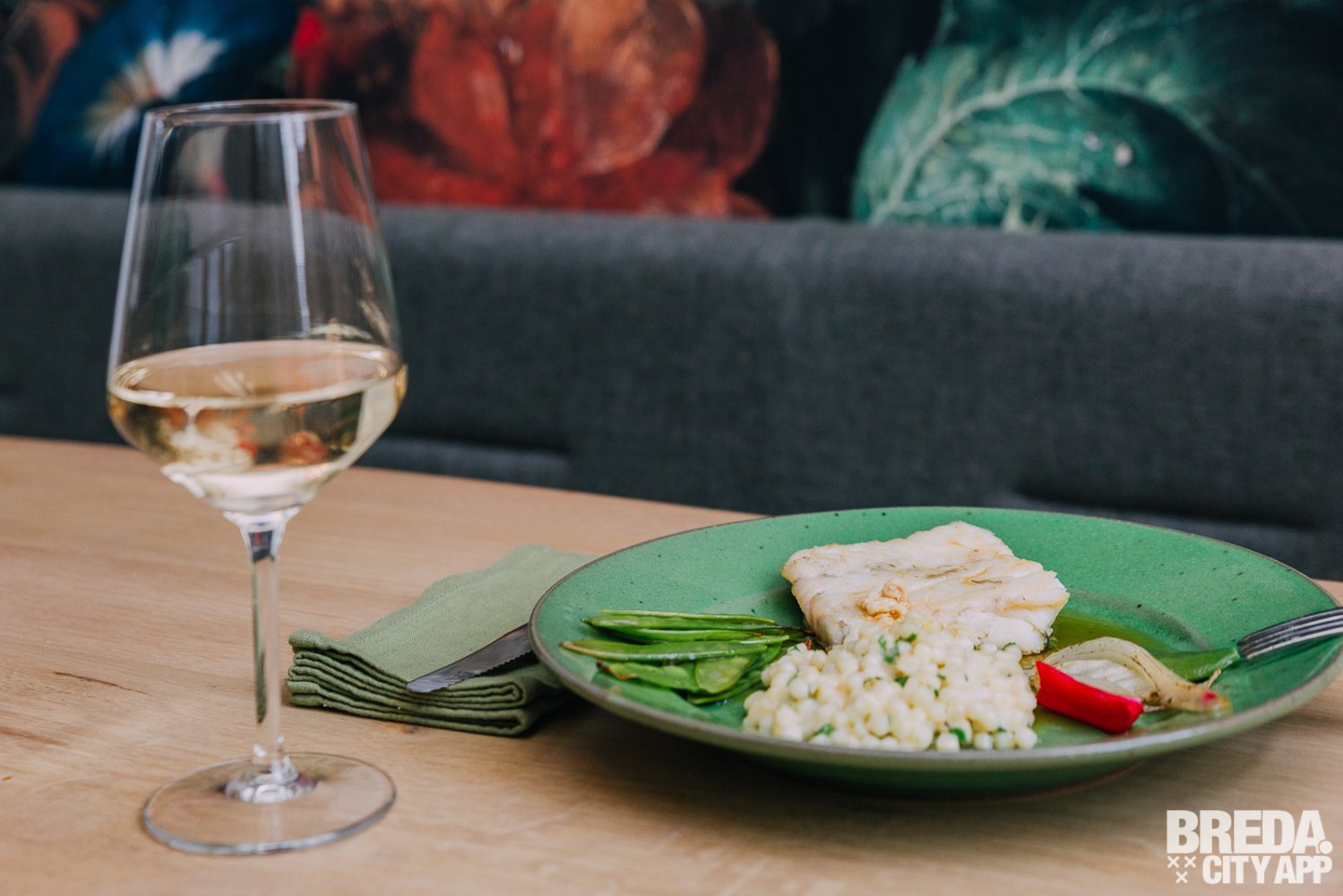 Het hoofdgerecht kan zó in de meegeleverde schaal de oven in. Geen gedoe met pannen, geen afwas. De laatste 5 minuten gaan onze borden mee de oven in en schenken we de volgende wijn in. Dan gieten we de warme Beurre Noisette over de vis en garneren ons bord met knapperige groenten en de Fregola Fenegriek. Op de website hebben we al kunnen lezen wat skrei precies is; een jonge winterkabeljauw die leeft in de Barentszzee en wordt gezien als een delicatesse. Even later begrijpen we waarom.