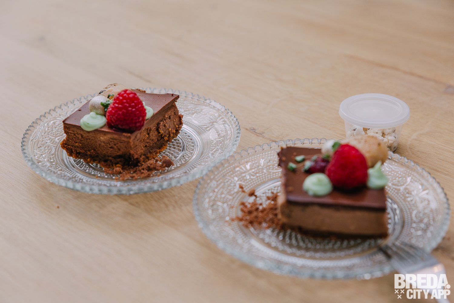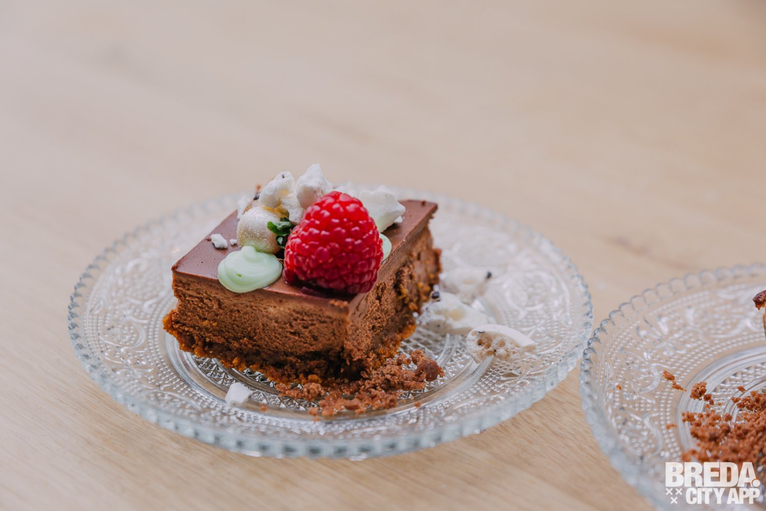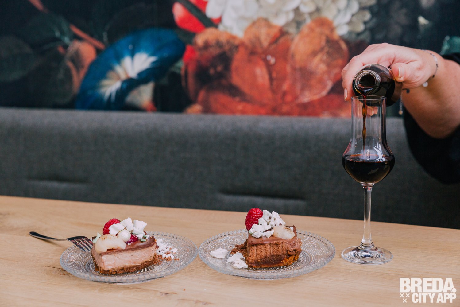 Na een korte break zijn we klaar voor het nagerecht: een uitermate fotogenieke chocolade cheesecake met een bodem van speculaas en krokante merengue. Dit dessert heeft alles; de zoete smaak van romige chocolade en subtiele hinten van fruit, munt en kaneel. De stroperige kruidige Pedro Ximénez met zijn aroma’s van gedroogde vijgen en noten vormt met de chocolade een combinatie om van te watertanden.