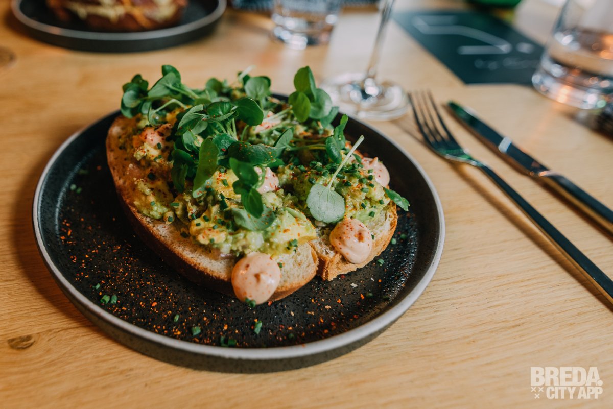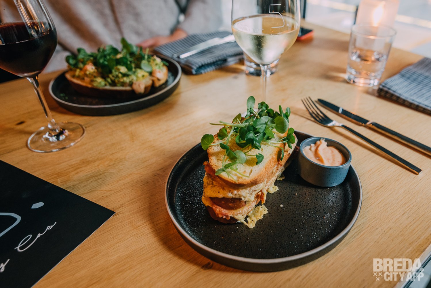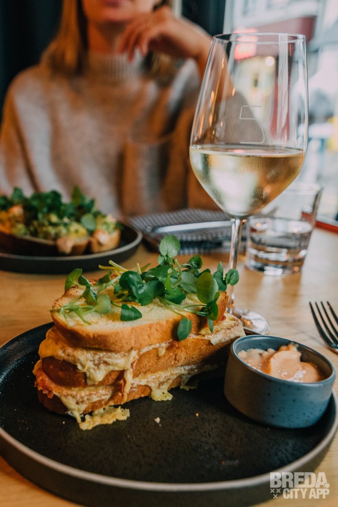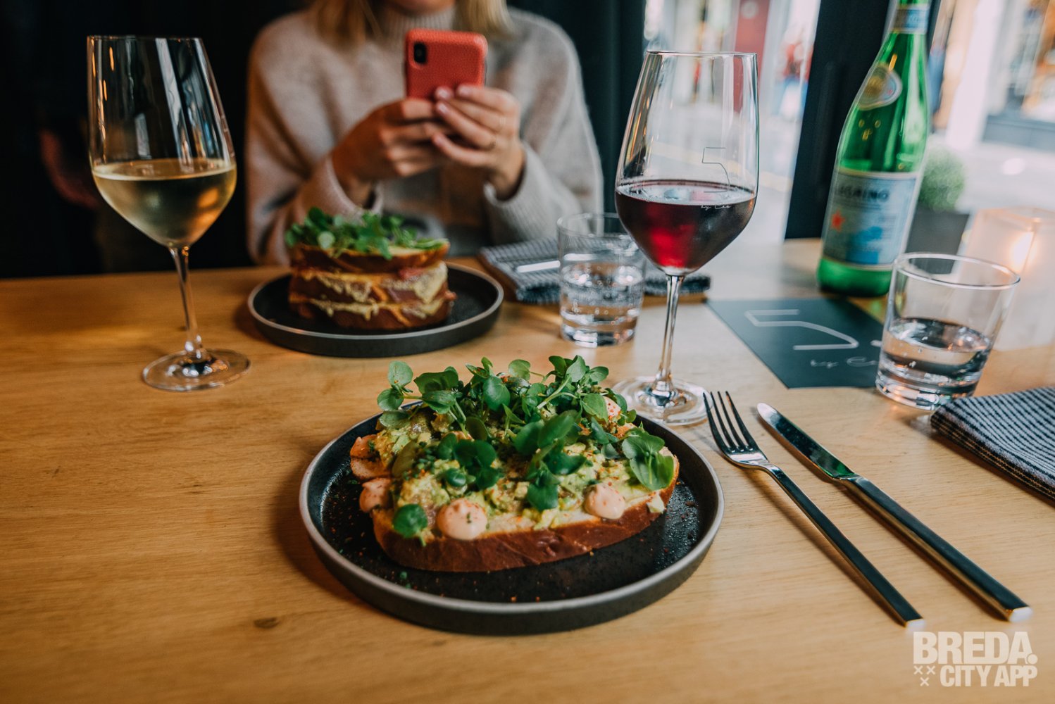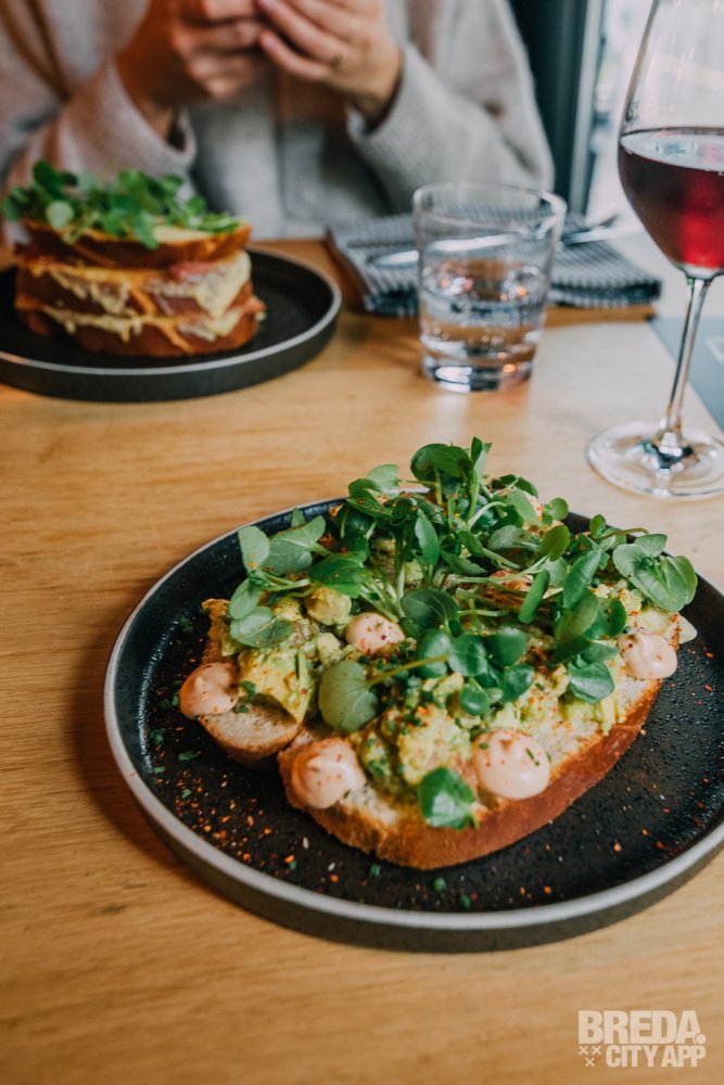 We nemen een kijkje op de kaart en vinden het moeilijk om te kiezen, dus besluiten we om ons te laten verrassen. Niet veel later komt het eerste broodje onze kant op met daarbij een passende witte wijn. Het huisgemaakte broodje avocado is ruim belegd en lekker smeuïg. De chili mayonaise zorgt voor een licht pikante en romige smaak. Genieten!