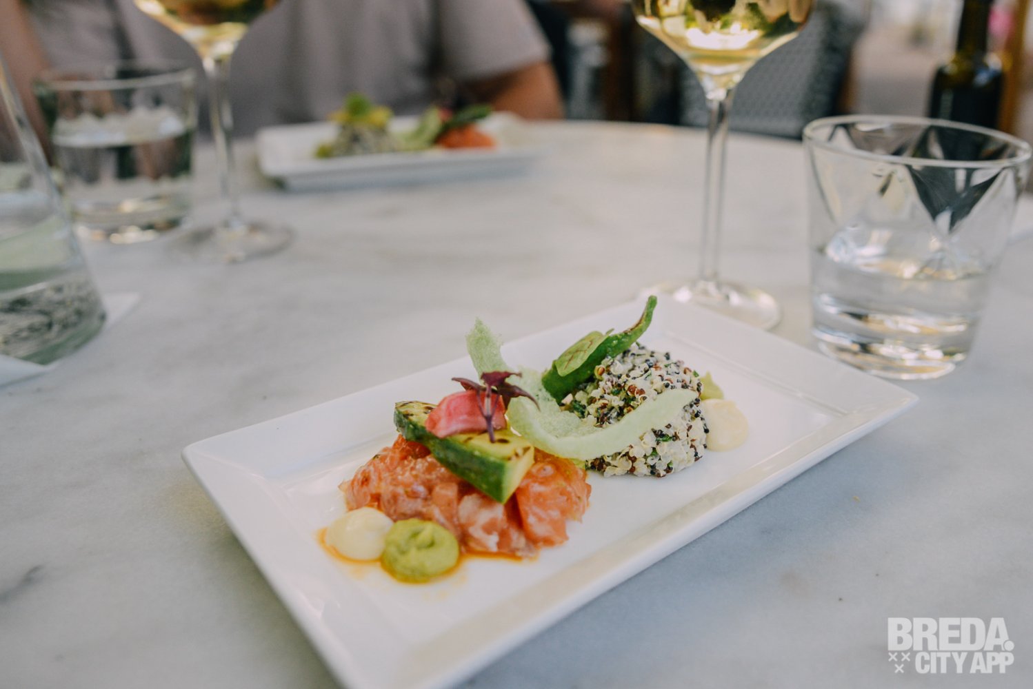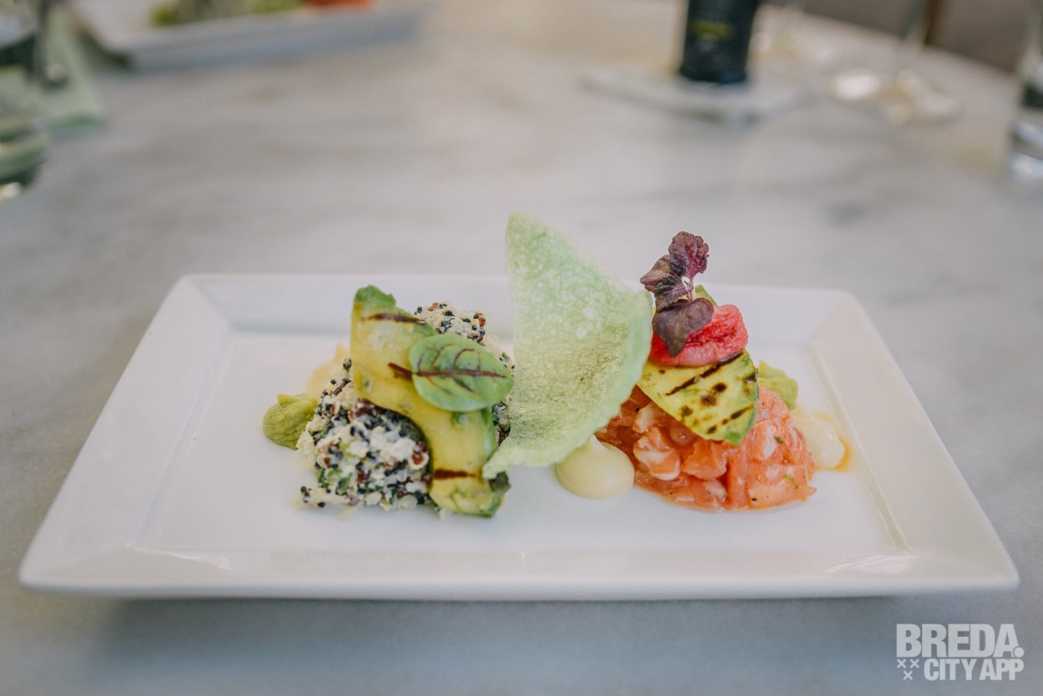 Wanneer de bubbels op zijn, staat de sommelier klaar met een Pinot Grigio; een Luisa Pinot Grigio om precies te zijn. Hij weet ons veel te vertellen over de wijnen en neemt ons mee in de historie van het in het Noord-Oosten van Italië gesitueerde familiebedrijf van Luisa. Deze strogele Luisa Pinot Grigio heeft een mooie gouden fonkeling en is een heerlijke aanvulling op het eerste voorgerecht: een ceviche van zalm met miso, quinoa en gerookte avocado van de Green Egg. De dressing van ponzu en mousse van limoen sluit prachtig aan op de wijn, welke smaakt naar nuances van tropisch fruit die aan het einde omzetten in een lichte hint van citrus. Een fris en zomers voorgerecht waarbij de smaak die de Green Egg aan het gerecht toevoegt subtiel centraal staat.