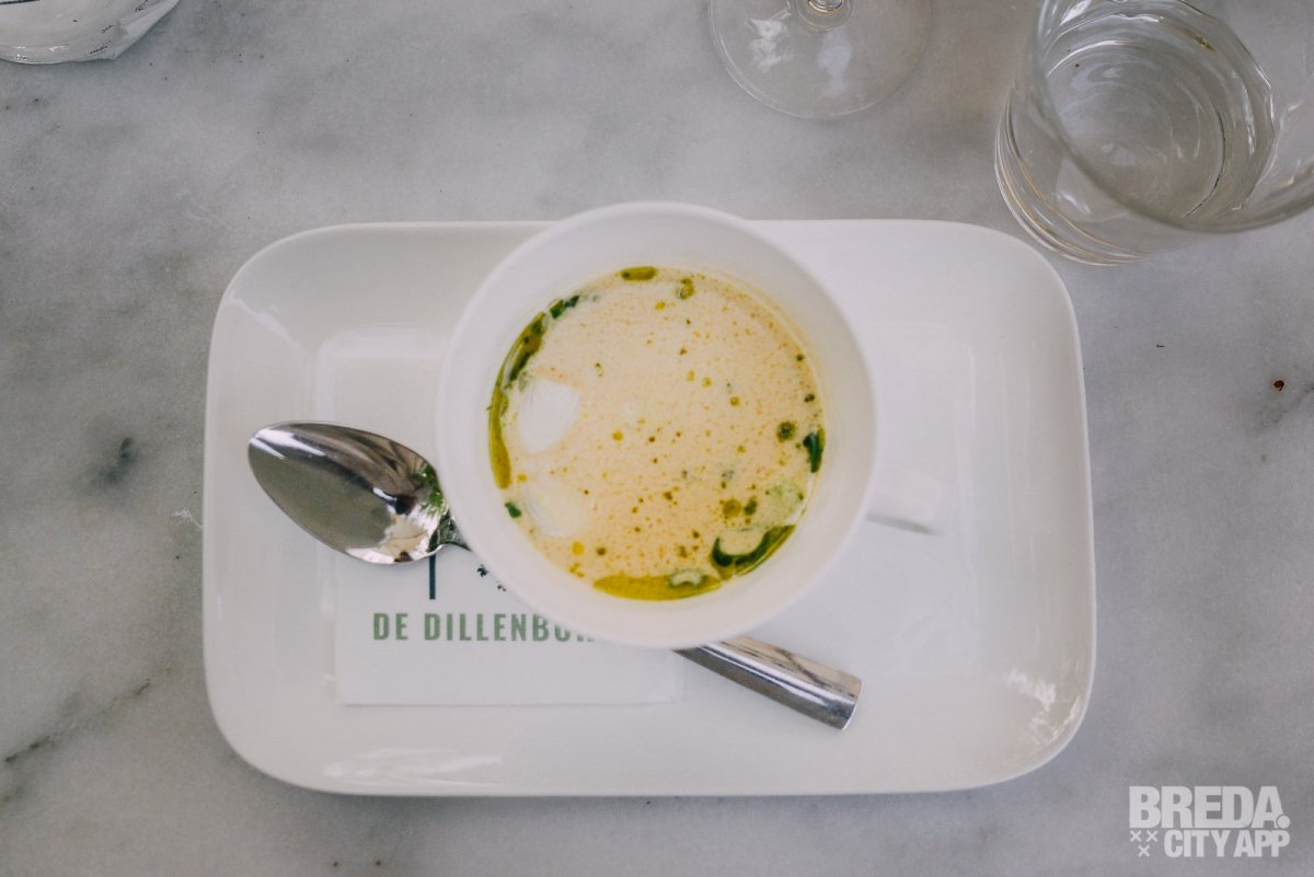 Het eerste tussengerecht bestaat uit een Aziatische aspergesoep en wordt vergezeld door een witte wijn uit Nieuw-Zeeland. De soep doet sterk denken aan de klassieke Tom Kha Khai door haar smaken van gember, kokos en citroengras. De Dillenburg geeft er echter haar eigen daai aan door hier geroosterde groene asperge aan toe te voegen - een combinatie die ik nog nooit had geproefd, maar ons uitermate goed bevalt! De wijn die we erbij drinken is de Yealands Estate, gemaakt van de Grüner Veltliner druif. Het smaakpalet hiervan is rijk en complex en bevat tonen van perzik, honing en kruiden. De volle, romige smaak van de wijn sluit mooi aan bij de kokosroom in aspergesoep.