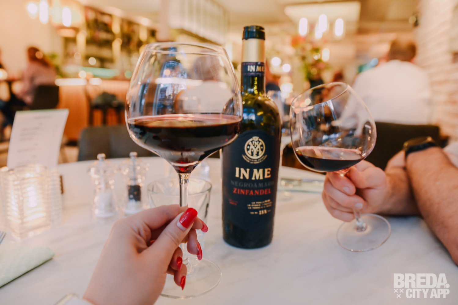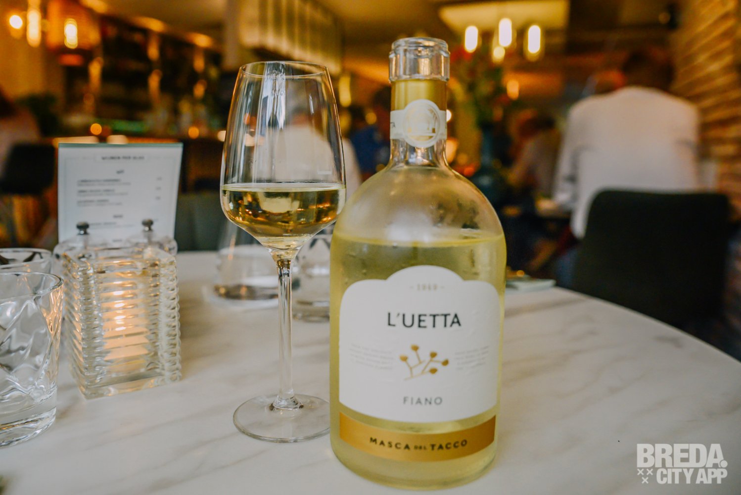 We genieten buiten nog even van onze wijn en verplaatsen ons voor het eerste hoofdgerecht naar het restaurant. Het restaurant is inmiddels goedgevuld en er heerst een gezellige, warme sfeer. Ondanks we een rode wijn verwachtte omdat we al 2 witte wijnen geserveerd hadden gekregen brengt de sommelier ons een prachtige fles witte wijn: een Masca del Tacco 2020 l'Uetta Fiano uit Puglia (Zuid-Italië). De wijn is gemaakt van de inheemse Fiano druif en is een award-winnende (97 pnt Luca Maroni; Goud Berliner Wine Throphy) én achteraf ook mijn absolute favoriet van de avond!