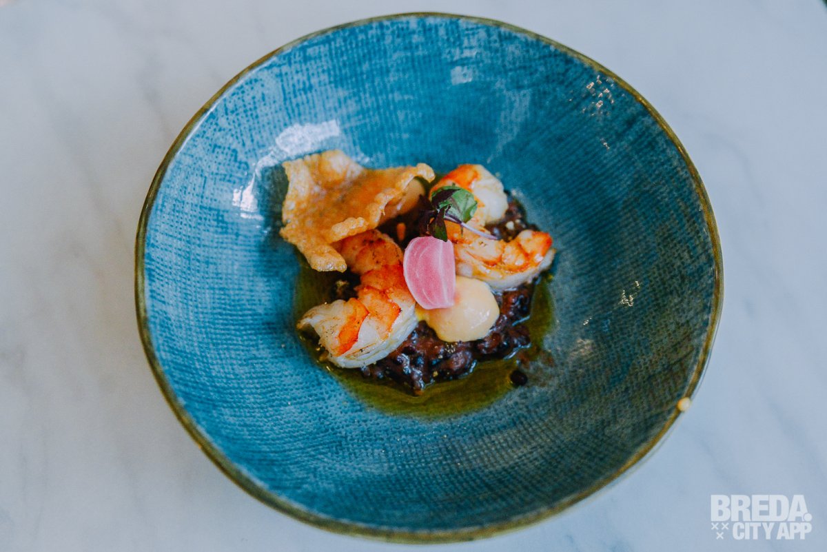 Het gerecht dat hierbij wordt geserveerd bestaat uit op de Green Egg gegrilde scampi's op zwarte venusrijst met radijs, rouille, gamba-olie en kroepoek van gerookte paprika. Een kleurrijk gerecht met een verfijnde smaak waarbij de diverse texturen voor een ware smaakexplosie zorgen. De wijn combineert perfect bij schaaldieren en maakt het gerecht fris en toegankelijk door de sensaties van exotisch fruit, witte meloen, peer, mandarijn en florale aroma's zoals witte bloemen.
