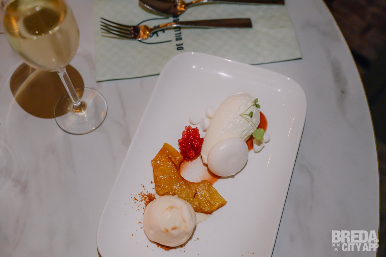 Tot slot sluiten we de avond natuurlijk af met een zoet dessert vergezeld door een fuitige Moscato - wederom uit Italië. Zelfs in het dessert staat het thema Green Egg centraal, aangezien de ananas hierop is gegrild. De rokerige smaak van de ananas past goed bij de zoete smaken van de rest van het dessert: de witte chocolademousse, frambozen tapioca, witte meringues, coulis van rabarber en het bijzonder lekkere gezouten karamel roomijs.