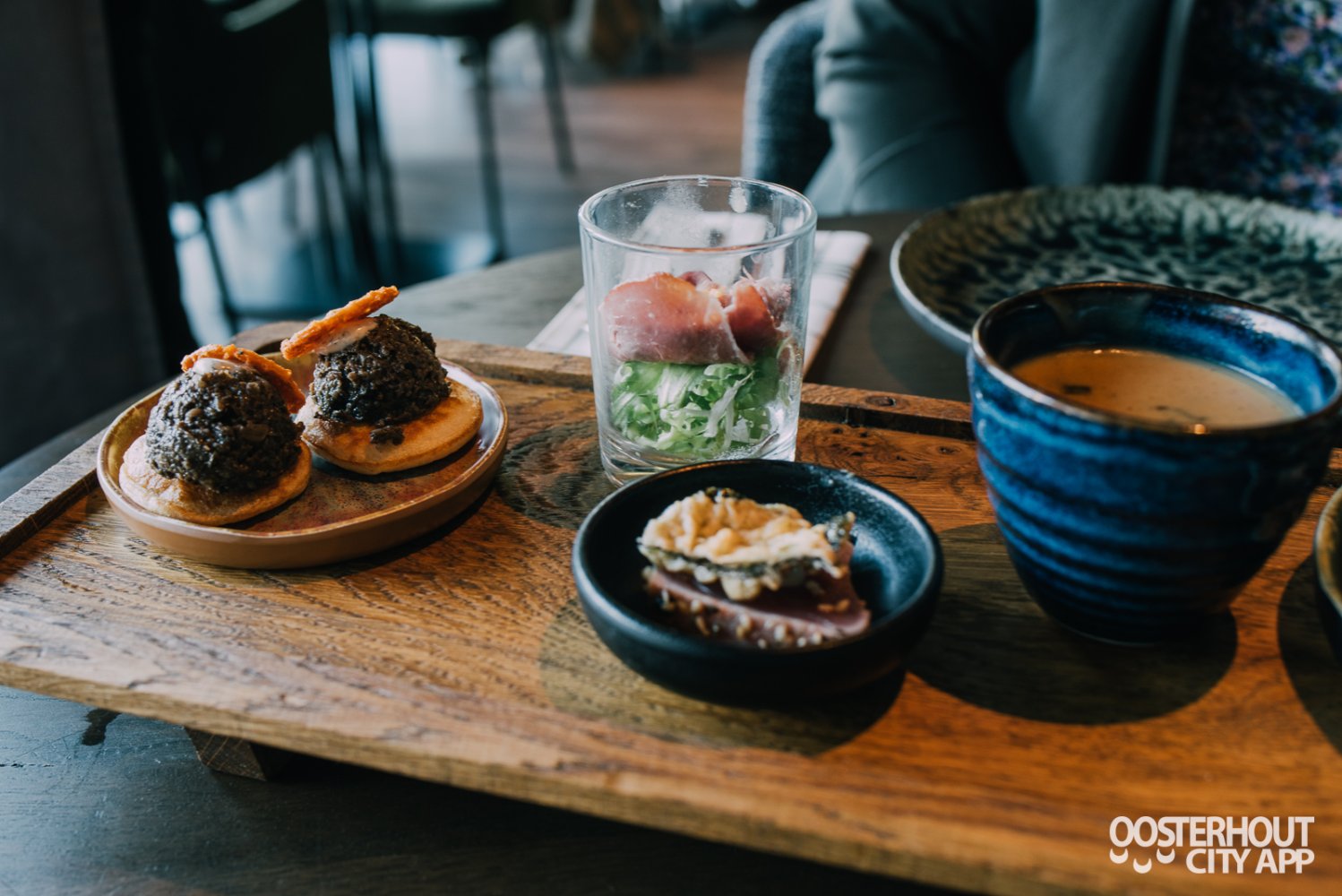 Op aanraden van het vriendelijke personeel kiezen we voor de 5-gangen proeverij en beginnen we onze smaakbeleving met de verschillende voorgerechten. Deze rijkelijk gevulde plank bestaat onder andere uit een romige en smaakvolle bospaddenstoelensoep en een bijpassende blini van duxelles van champignons en truffelmayonaise. Beiden zijn heerlijk zacht van smaak.