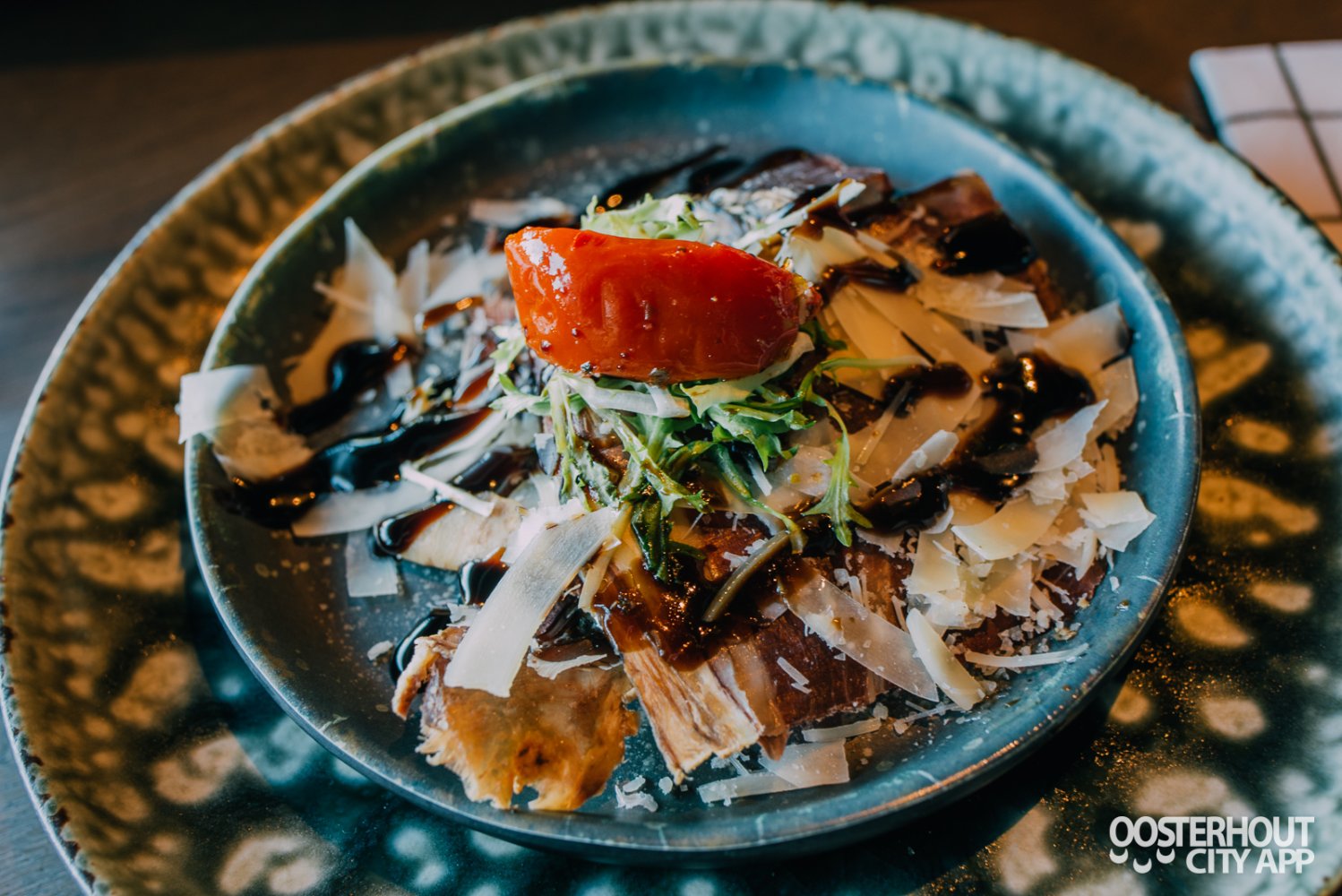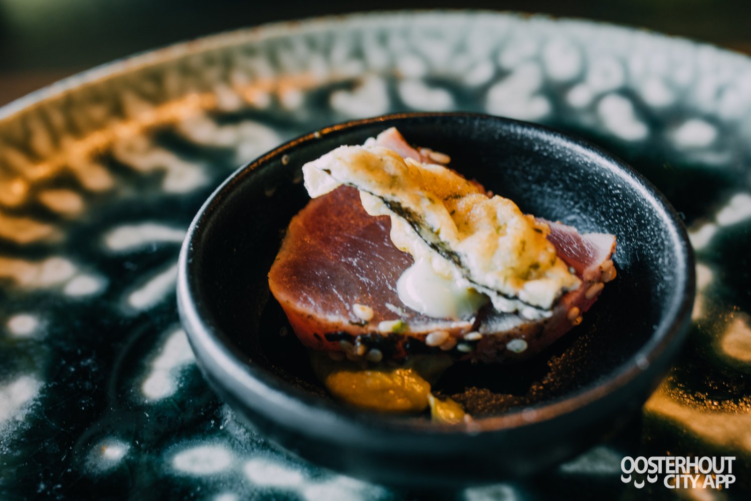 Daarnaast krijgen we gerookte eendenborst met frisé en sinaasappelglaze, een gedroogde ham (cecina de león) met Parmezaan en zongedroogde tomaat én tonijn tataki met avocadocrème en Japanse mayonaise. We genieten van al het lekkers van de eerste plank en zijn erg benieuwd naar de volgende gangen!