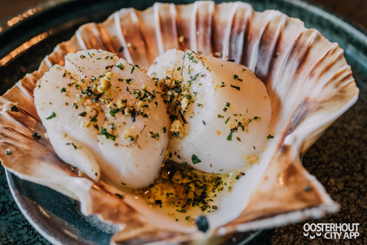 Daarnaast de coquilles, deze worden geserveerd met beurre noisette en zeekraal". Het is een aangename verrassing dat verschillende gerechten van de proeverij bereid zijn op de eigen Jospergrill.