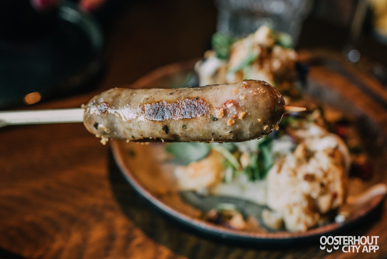 De tweede plank bestaat uit verschillende tussengerechten. Allereerst de smoked sausage: het is meteen te proeven dat deze gegrild is op de eigen Jospergrill, de rokerige smaak is fenomenaal. Grillen en roken op houtskool in combinatie met verse kruiden, dat is de keuken van Het Houtse Meer.