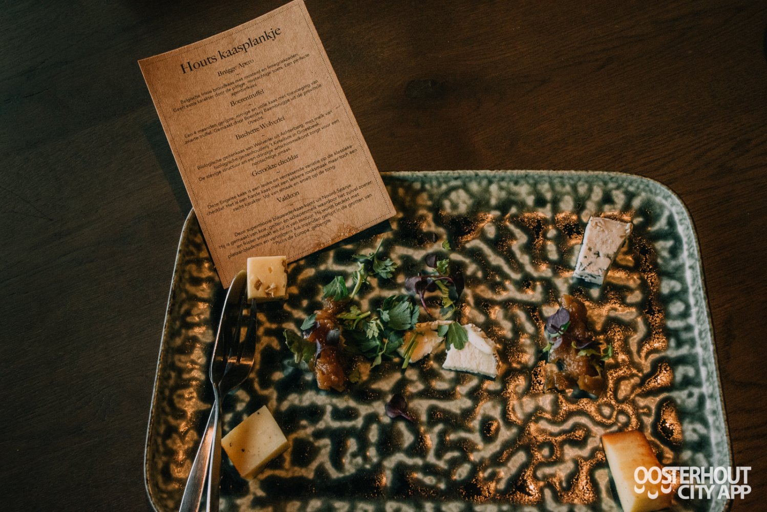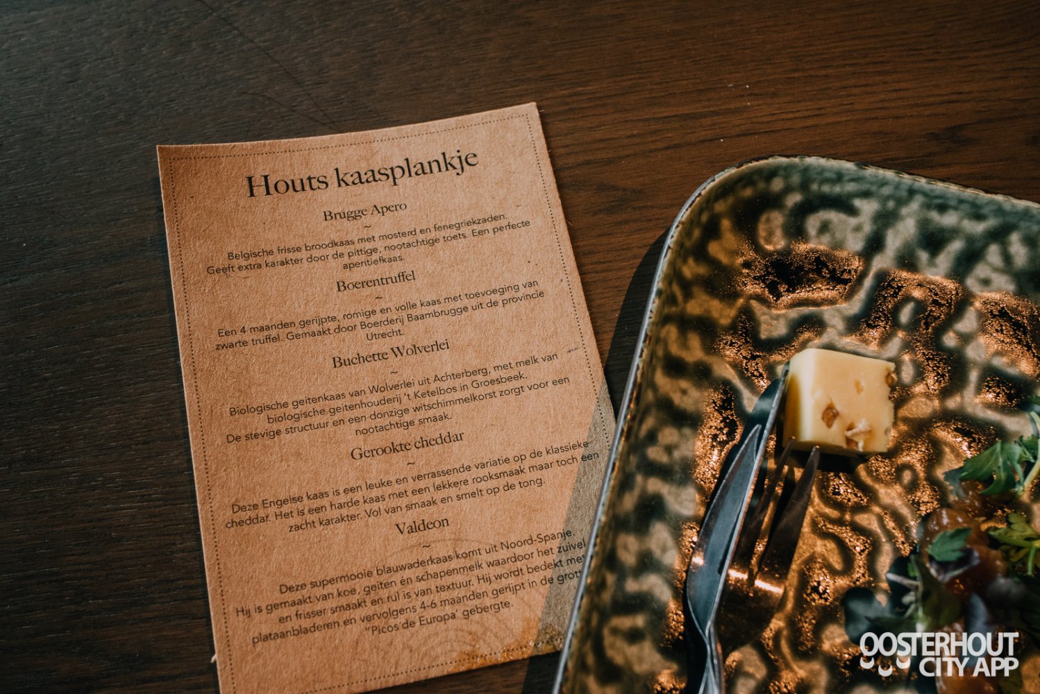 We sluiten af met het Houts kaasplankje. We proeven vijf verschillende kazen, namelijk: Brugge Apero, boerentruffelkaas, Buchette Wolverlei, gerookte cheddar en Valdeon. Een heerlijke afsluiter van een geweldige proeverij.