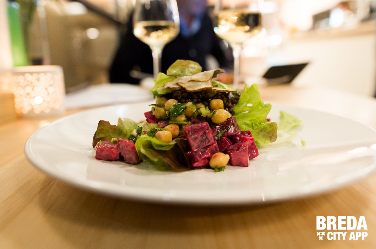 We genieten van een gevarieerde salade van onder andere bieten en kikkererwten met een smaakvolle dot kimchi en een notendressing. De combinatie van verse ingrediënten en huisgemaakte dressing vormen een goede start van de avond! Dit smaakt naar meer!