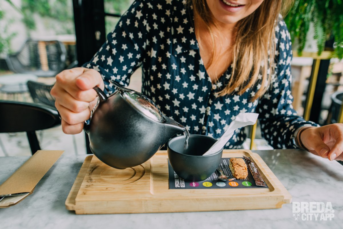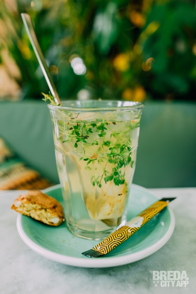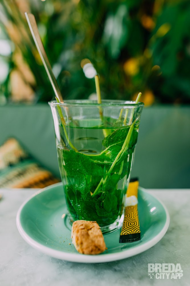 Nu we bijna bij het einde van de high tea aan zijn gekomen, zijn we ook erg benieuwd naar de theespecialiteiten die we op de kaart ontdekt hebben: Marrokkaanse muntthee en Gember&citroentijm. De Marrokkaanse muntthee smaakt hoe verse muntthee moet zijn en de Gember&citroentijm bevalt ook erg goed. De gember wordt voor deze thee erg fijn gesneden, zodat de smaken goed tot hun recht komen.