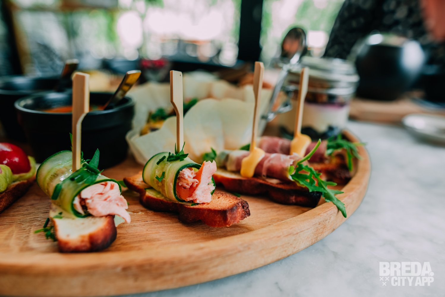 Ook de bruschetta's zien er super lekker uit. De eerste die we proberen is de vegetarische variant met guacamole, tomaat en olijf. De guacamole is lekker zacht en de bruschetta erg knapperig. Dit smaakt naar meer, dus we beginnen meteen aan de bruschetta met warm gerookte zalm. De zalm is zacht en goed gegaard en het frisje van de komkommer past hier goed bij. De prosecco dressing maakt het geheel helemaal af. De laatste bruschetta is belegd met Limburgs kloostervarken en rucola. Leuk weetje: deze varkens krijgen eikeltjes te eten en dit proef je ook echt. De bruschetta is afgetopt met de geheime Anne & Max clubsaus.