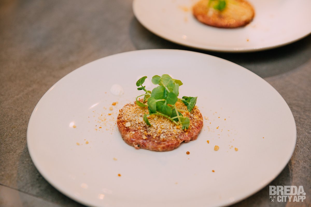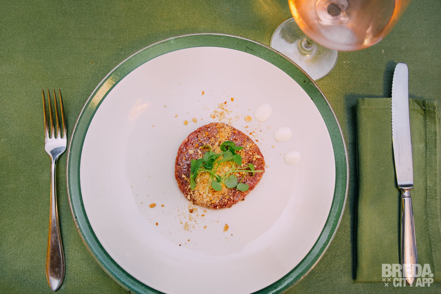 We krijgen er meteen lol in de componenten uit de box tot een chef waardig gerecht te bereiden en zo staat ook gang 2, de steak tartaar, binnen een handomdraai op tafel. De bijgaande pipetjes bevatten ware smaakbommetjes en zijn erg handig om de borden professioneel mee op te maken. Het tussendoor bereiden van de gangen blijkt bovendien een prettige en actieve afwisseling voor ons. De steak tartaar garneren we met een fijne mayonaise, broodkruimel en waterkers. De elegante rosé is met zijn tonen van witte peer en framboos een perfecte begeleider bij deze mooie gang.
