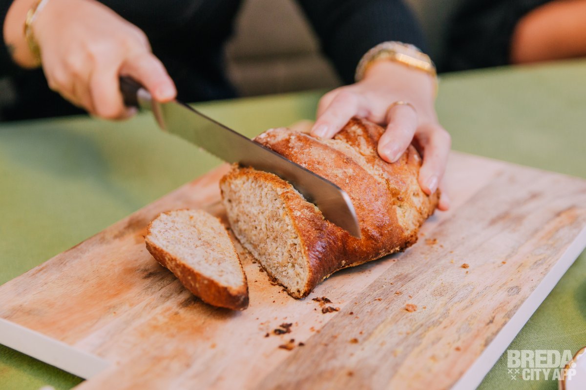 Terwijl we de soep opwarmen halen we het broodje uit de oven. Ik vermoed een zuurdesem die bijzonder smaakvol is en komt met een huisgemaakte kruidenboter. Als olijfolie fans zetten we nog een mooie fles en wat zout op tafel. We schenken onze glazen nog eens bij terwijl we genieten van deze fluweelzachte soep van verse pastinaak. Als pastinaak een vergeten groente is wordt hij bij deze weer op de kaart gezet. Nog een voordeel van thuis dineren: we kunnen onze bordjes ongegeneerd uitlikken :-)
