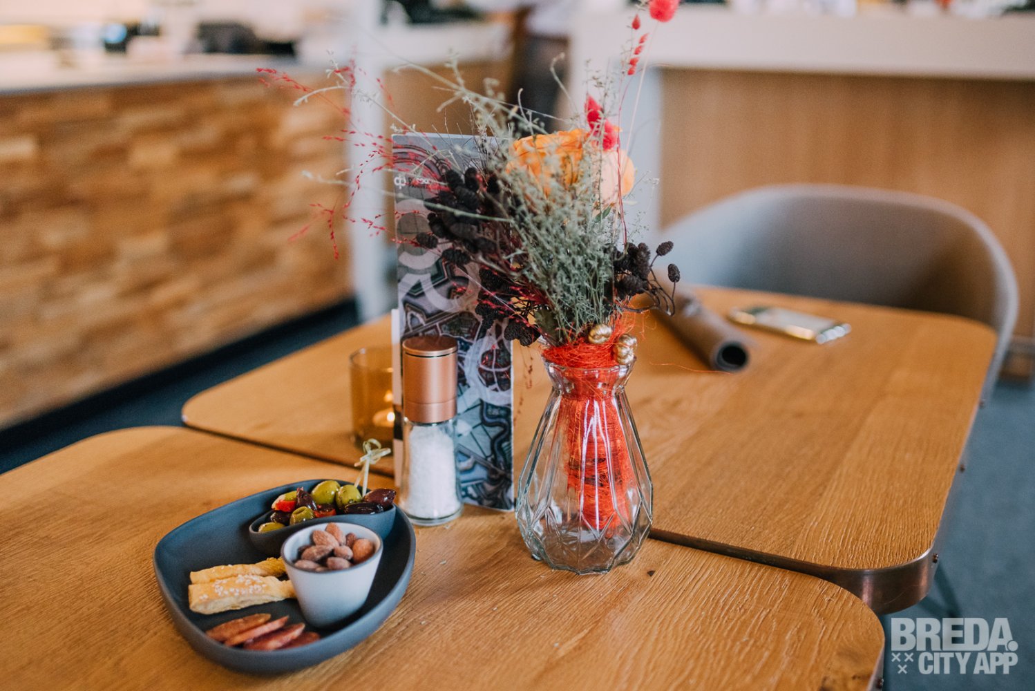 Met de lift gaan we naar de eerste verdieping van dit prachtige gebouw. Wat ons meteen opvalt is dat ze hier heel netjes omgaan met alle regels rondom het Coronavirus. Het tafeltje waaraan we plaatsnemen is sfeervol aangekleed met bloemen, mooi servies en een schaaltje met olijven, zoute stengels, chorizo en geroosterde amandelen.