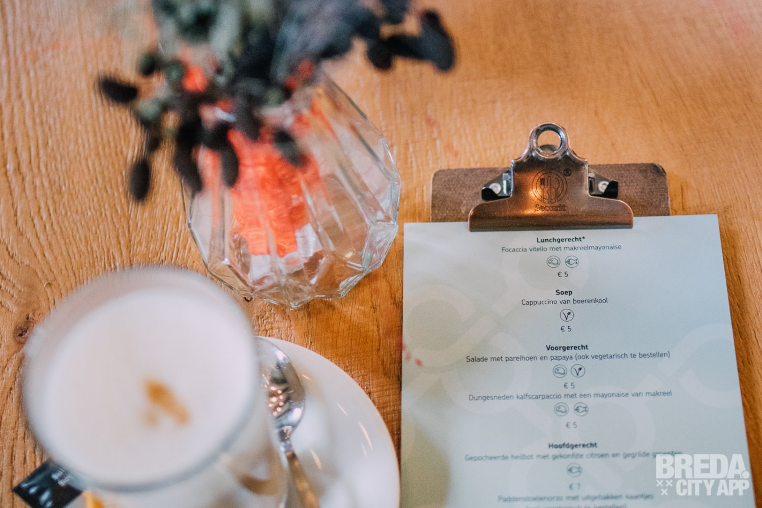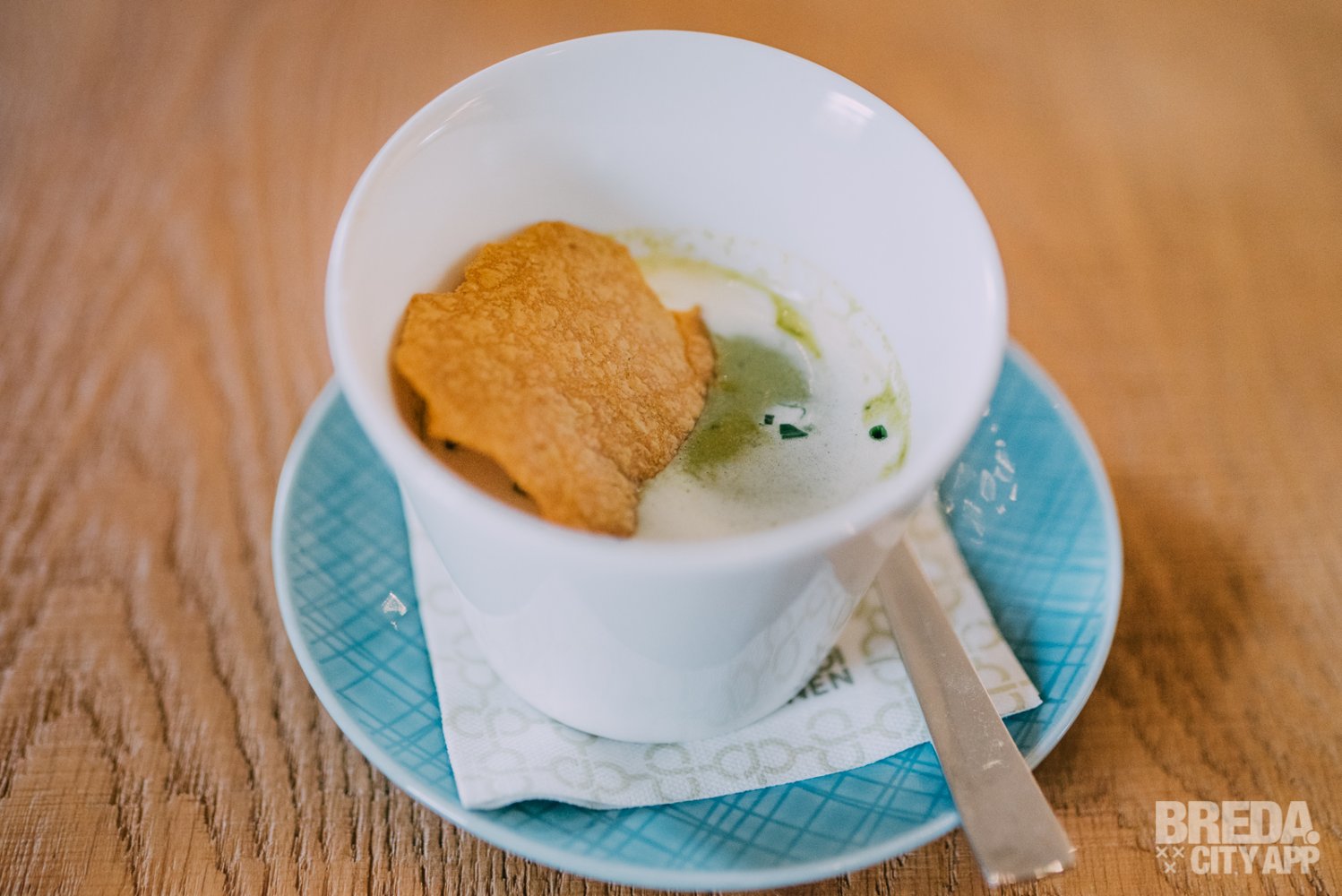 Kort daarna krijgen we de eerste gang opgediend: een soepje. Het is een 'cappuccino' van boerenkool met een krokantje. De soep is erg lekker en de smaak van de boerenkool komt goed tot zijn recht.