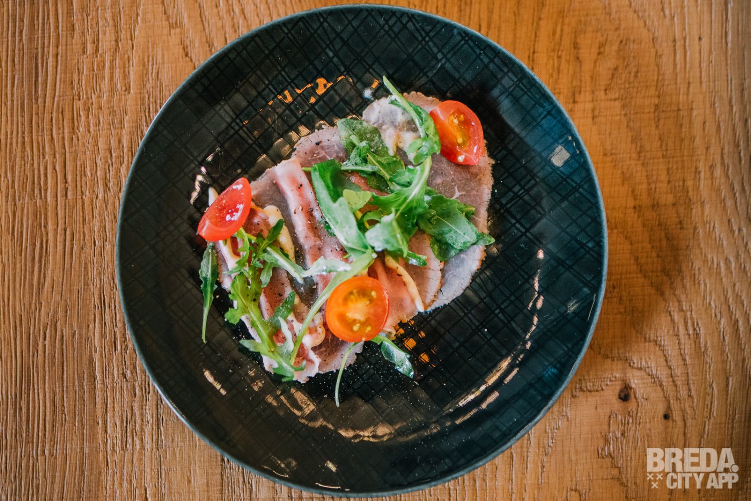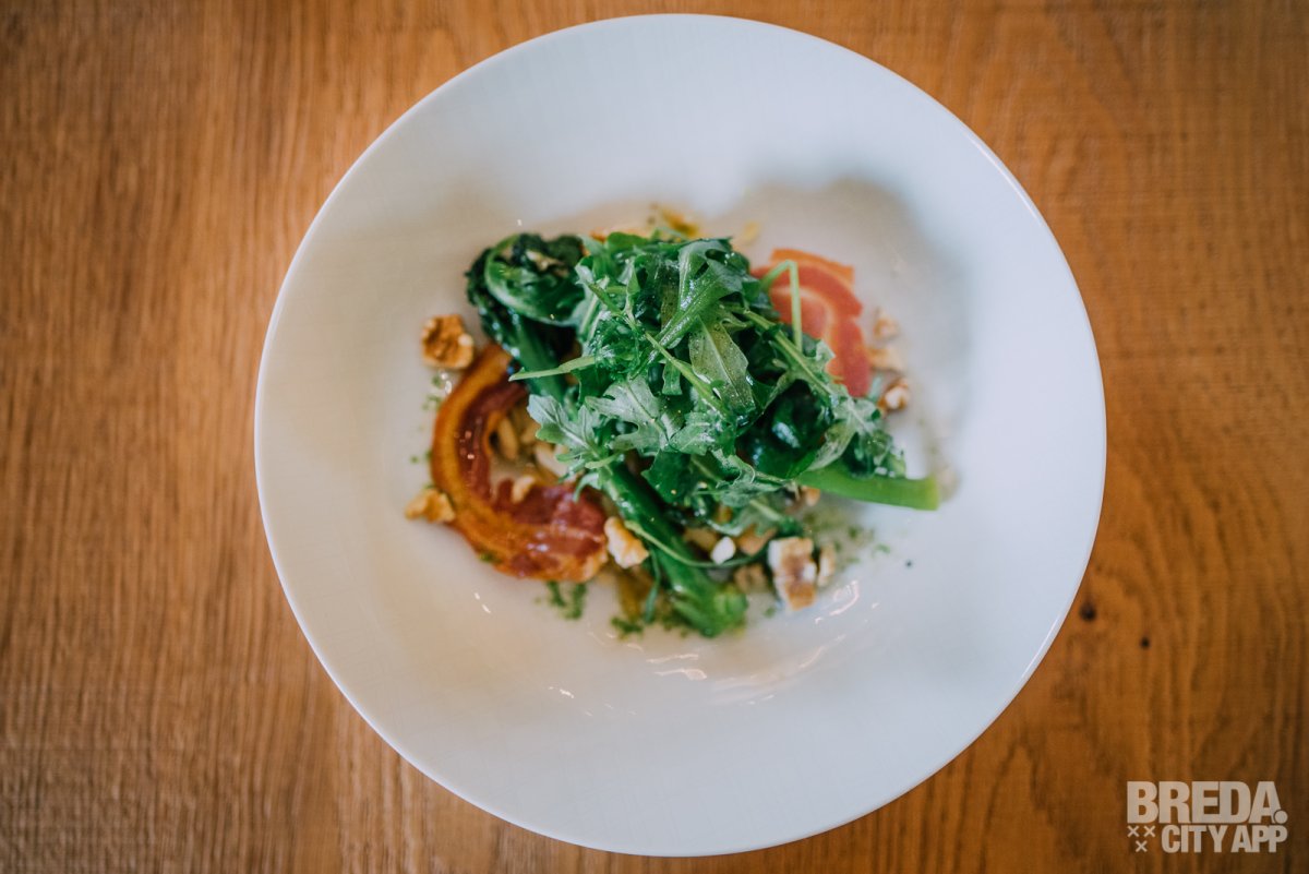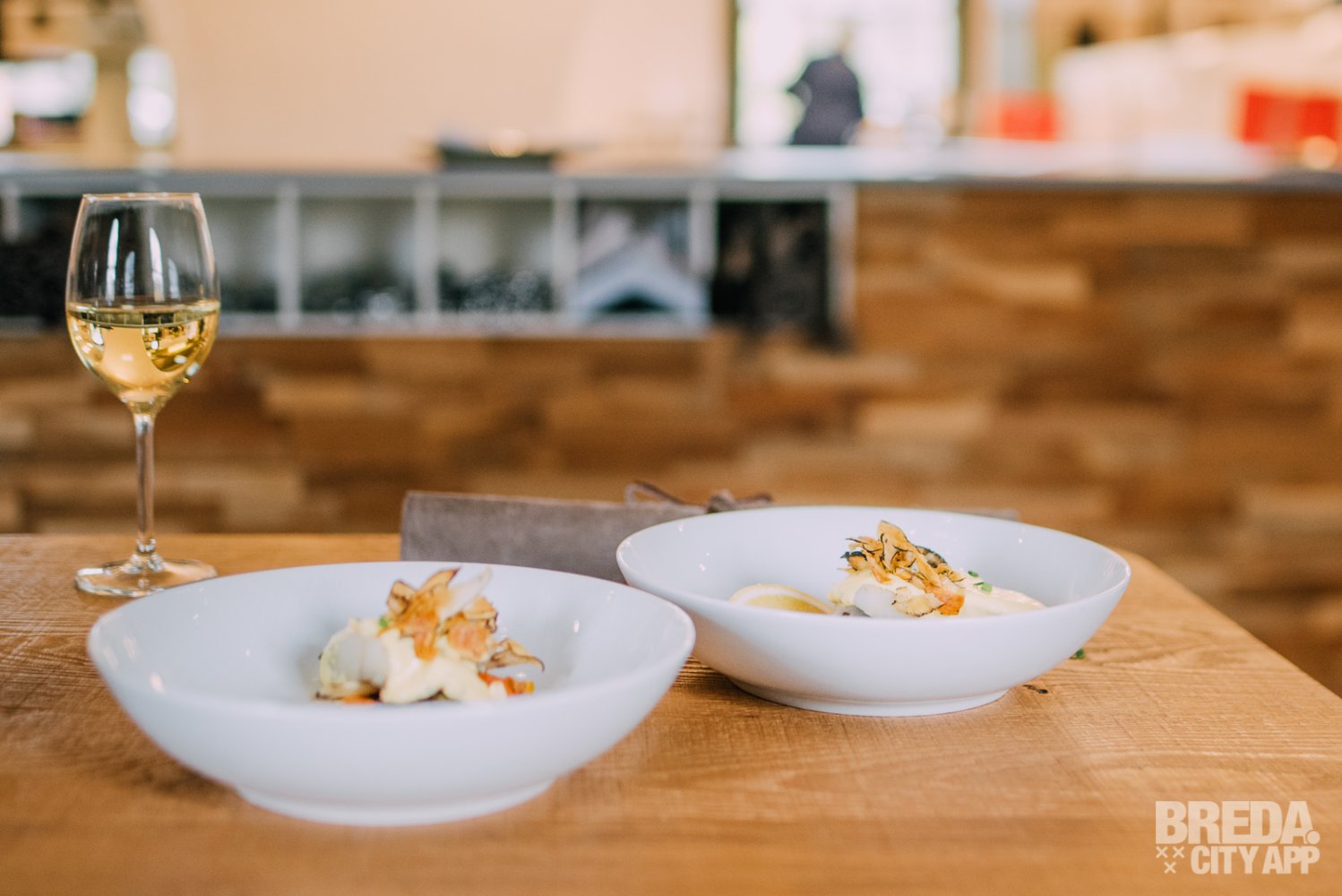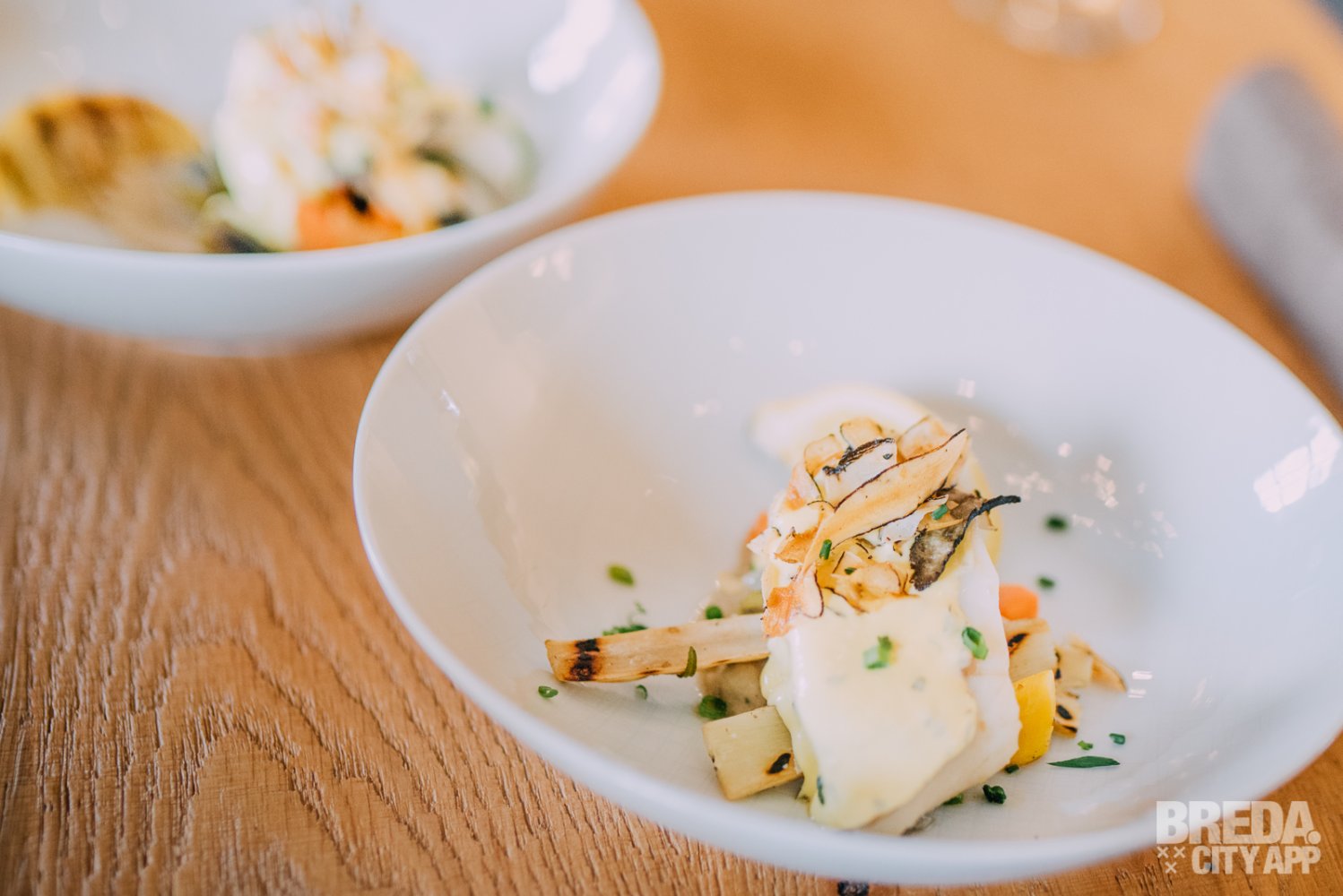 Dan komt er een lekker voorgerecht! Dungesneden kalfscarpaccio met mayonaise van makreel. Bij ieder gerechtje krijgen we naast nieuw bestek ook een nette uitleg. Wij zitten te genieten en besluiten een wijntje te bestellen als mooie begeleider bij deze lekkere gerechten!