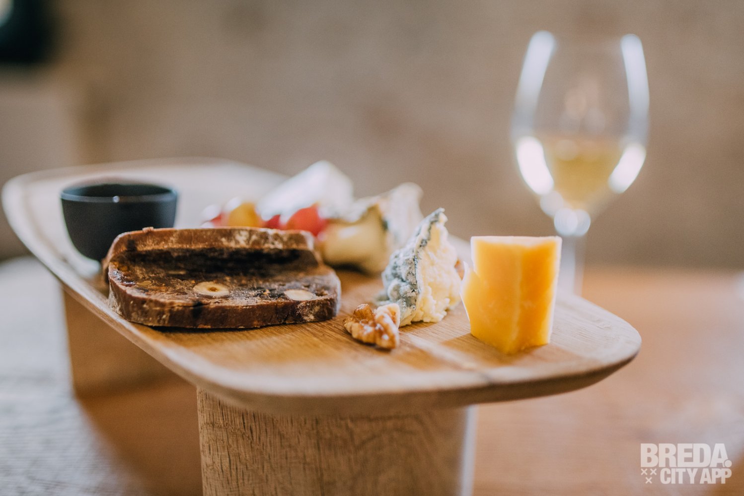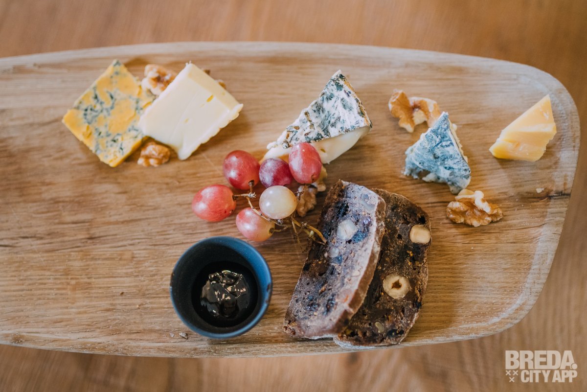 Een uitgebreid kaasplankje komt onze kant op. Het kaasplateau bestaat uit walnoten, druiven, notenbrood, stroop en natuurlijk 5 kazen. De eerste die we proeven is het Grijs Spetserke, vernoemd naar de inwoners van Merksplas. Het is een kaas van rauwe koemelk met houtskoolas. Dit is heel bijzonder want dat zie je normaal alleen bij geitenkaas. Verder de Skaepsbloem, wat een kaas is van gepasteuriseerde schapenmelk uit Amsterdam, bewerkt met gedroogde kruiden.
