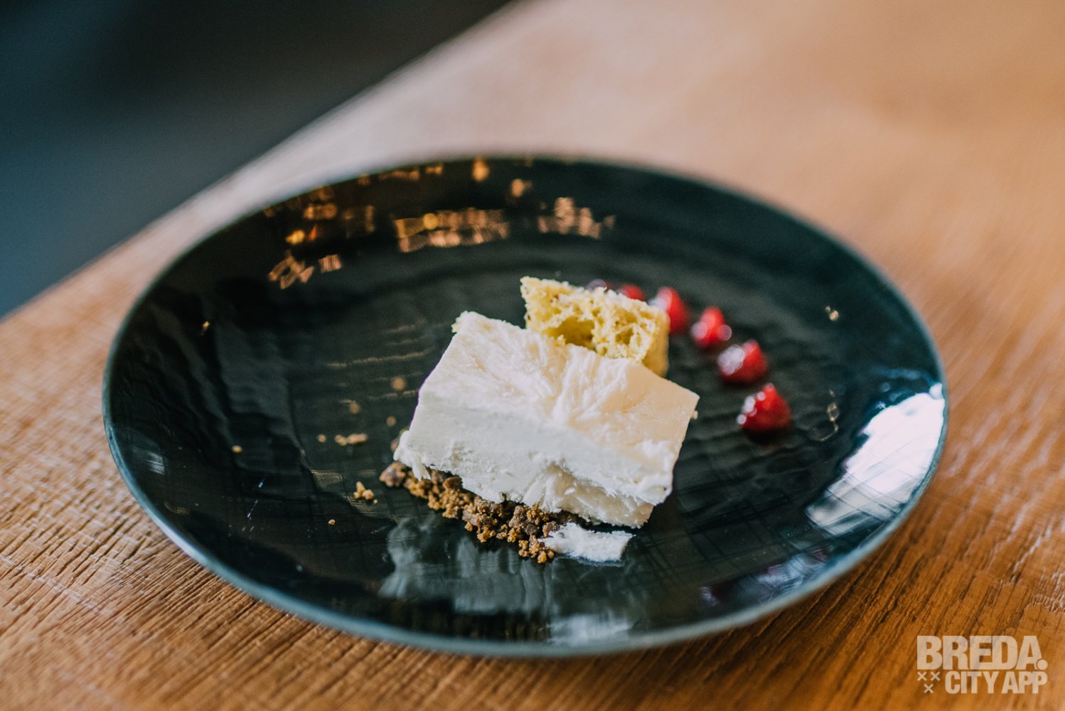 Om de lunch af te sluiten gaan we nog een zoet nagerecht proeven. Dit is een vanille parfait met groene thee, pistache spongecake en matcha crumble afgemaakt met een gel van framboos.