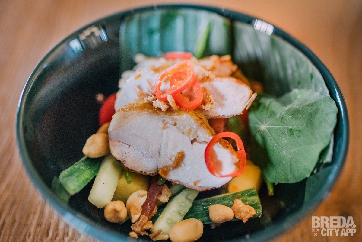 De eerstejaarsstudenten doen naast de restaurantmanager en de koks in de keuken enorm hun best om ons een mooie lunch voor te schotelen. Een salade met parelhoen en papaya, die eventueel ook vegetarisch kan, volgt. Dit is echt heerlijk en er zit een beetje pit in door de rode peper die erin is verwerkt.