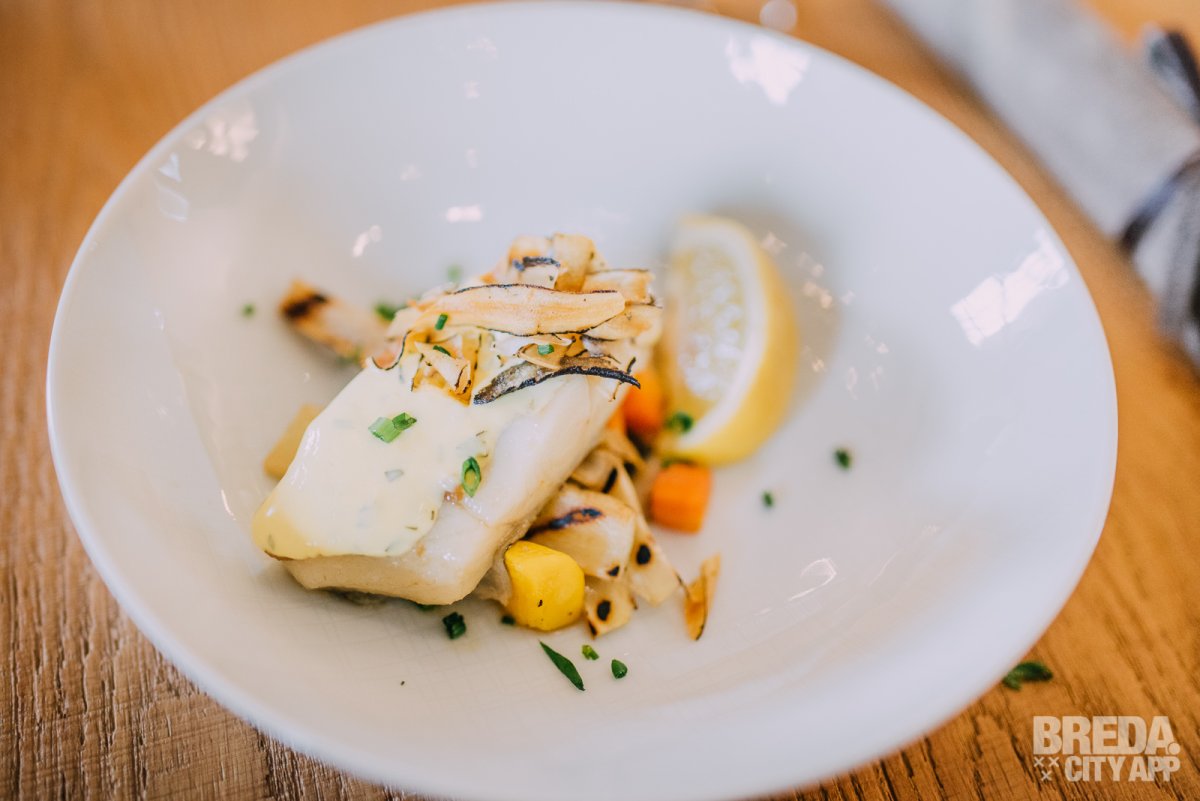 Het tweede hoofdgerecht mogen we ook proeven. Het is een gepocheerd heilbot met gekonfijte citroen en gegrilde groenten. Ook heel smakelijk! Omdat we alle gerechten delen kunnen we ook het dessert nog wel proberen, ook al twijfelen we wel of we nog ruimte hebben.