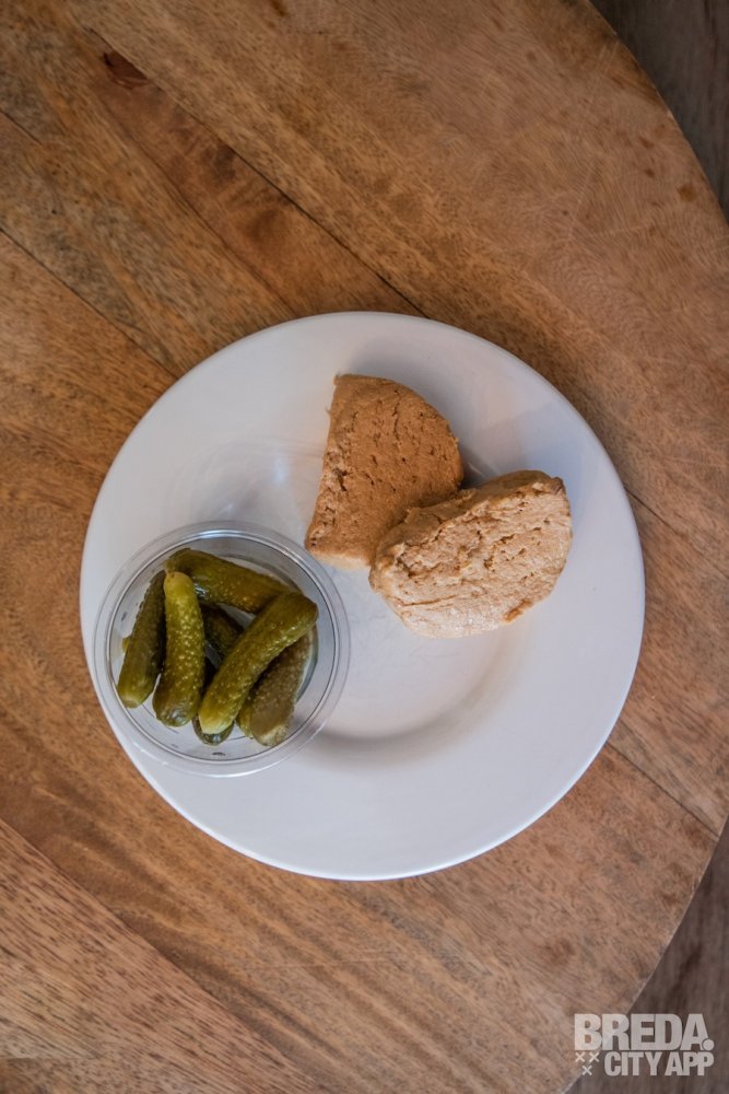 Het laatste, maar zeker niet het minste waar we van genieten zijn de rilette van konijn en de huisgemaakte paté. We beginnen met de rilette van konijn. Voor als je je afvraagt wat rilette is: het is een smeersel bereid uit vlees en eigenlijk een beetje vergelijkbaar met paté. Het vlees is gezouten en in vet gekookt waardoor er eigenlijk een soort smeerbare pasta ontstaat. De rilette is romig en zacht. In combinatie met een cornichon resulteert het in een ware smaaksensatie. Canapé eronder en klaar!