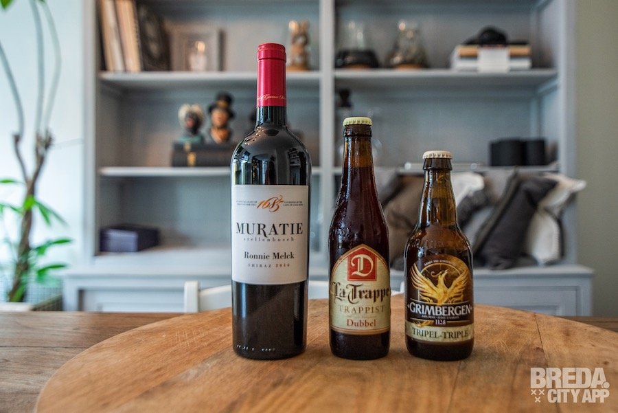 De borrelbox van Boswachter Liesbosch is niet alleen gevuld met heerlijke hapjes. Ook aan de drank is gedacht. Zo proeven we twee speciaalbieren: een La Trappe Dubbel met smaken van karamel, honing, dalen en gedroogd fruit én een pittige, bitterzoete Grimbergen Tripel. Naast de bieren treffen wij een mooie fles wijn aan. We proeven de dieprode Mutatie Ronnie Melck's Shiraz uit 2016 met aroma's van bessen, kruiden en chocolade. De smaak is krachtig met veel fruit, precies waar wij van houden!