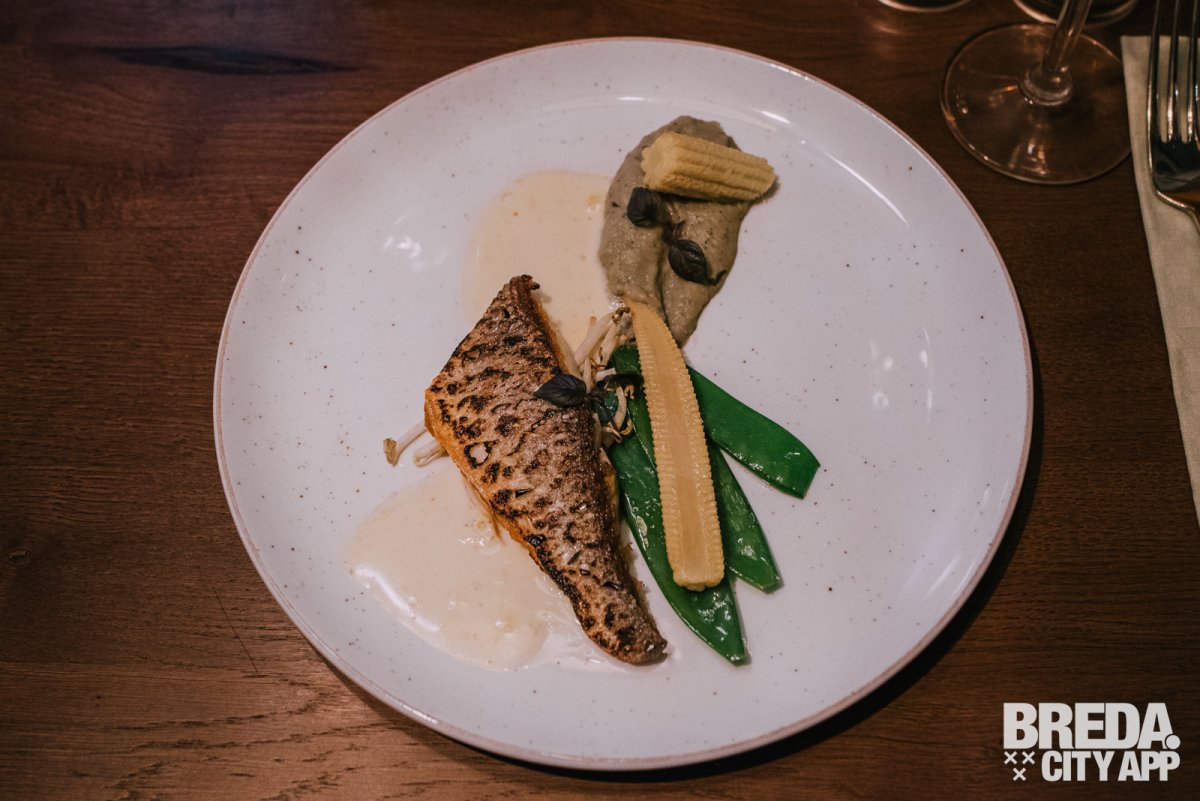 Het vierde gerecht was de Aziatische Dorade. Op de huid gebakken en geserveerd met een saus van gele curry en kokos, gebrande maïs, baby maïs, peultjes, taugé en crème aubergine. De Cle de la Source Grenache Viognier uit Languedoc, Frankrijk, voegt een verfrissende touch toe aan de exotische smaken van de dorade.