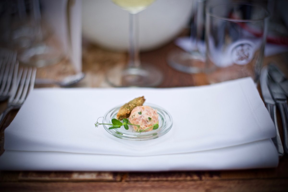 Gerookte zalm met gefrituurde groene asperge.