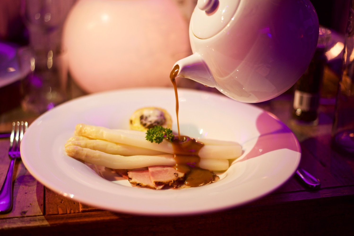 Beekse beenham met verse asperges van het land, aardappelraatje met paddestoelen en een overheerlijke tuinkruiden jus.