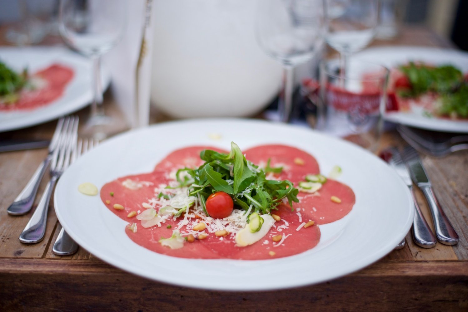 Carpaccio gevuld met asperges en een paprikapeso geserveerd met spaghetti van groene asperges.