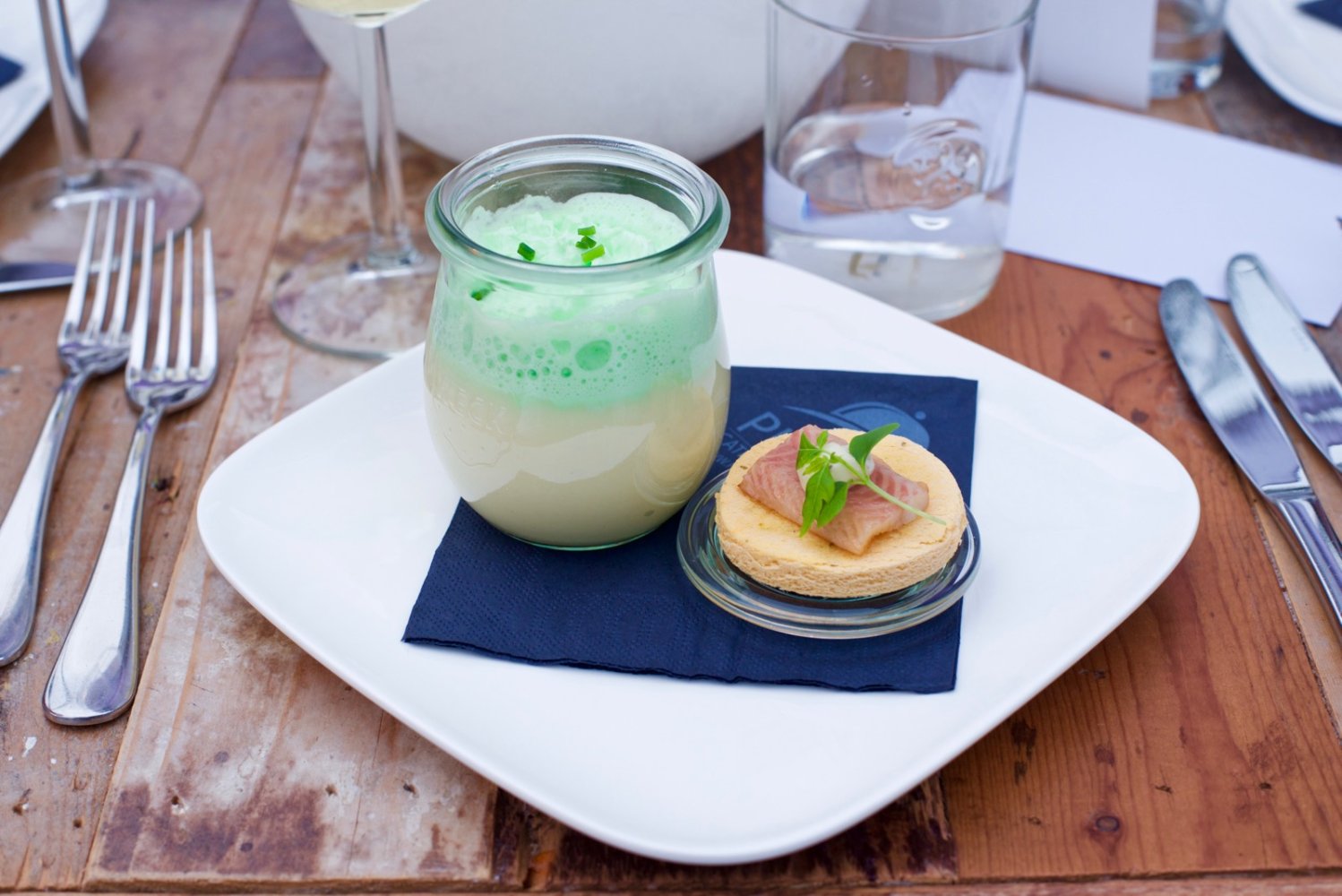 In een weckpotje geserveerde roomsoep van asperges met een toastje gerookte paling en een room van paarse asperges.
