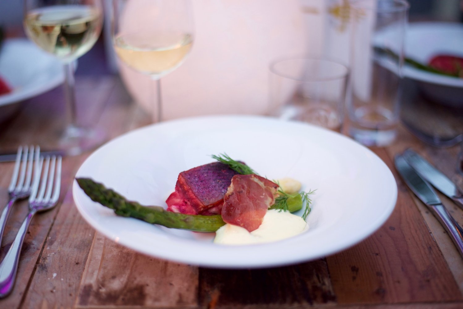 Zalmfilet gemarineerd in sap van rode biet en limoncello geserveerd met gegrilde groene en witte asperges, krokante van Coppa di Parma en Hollandaisesaus met limoen.