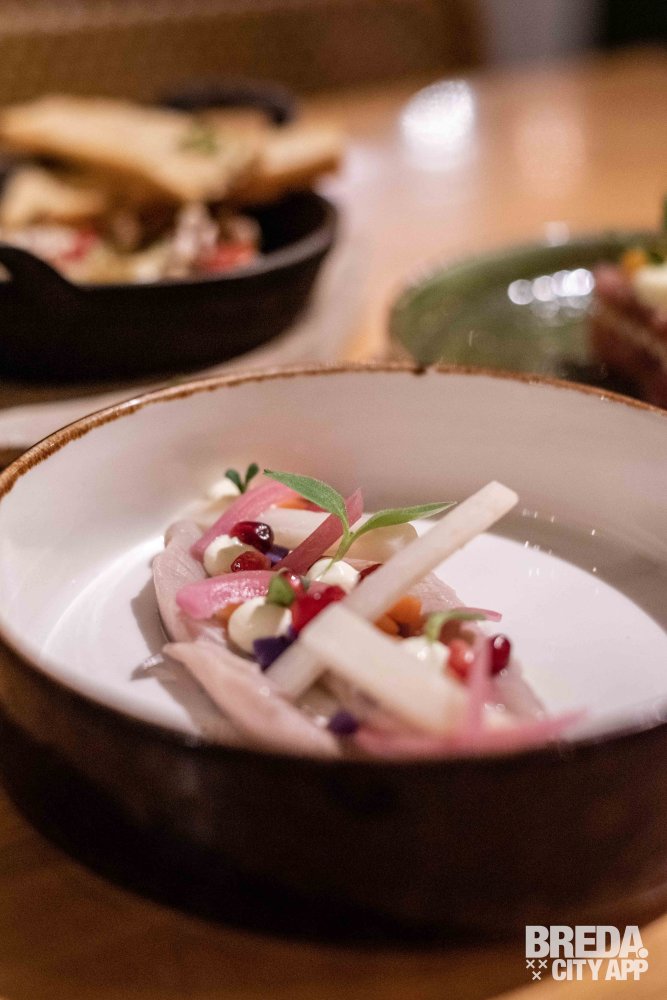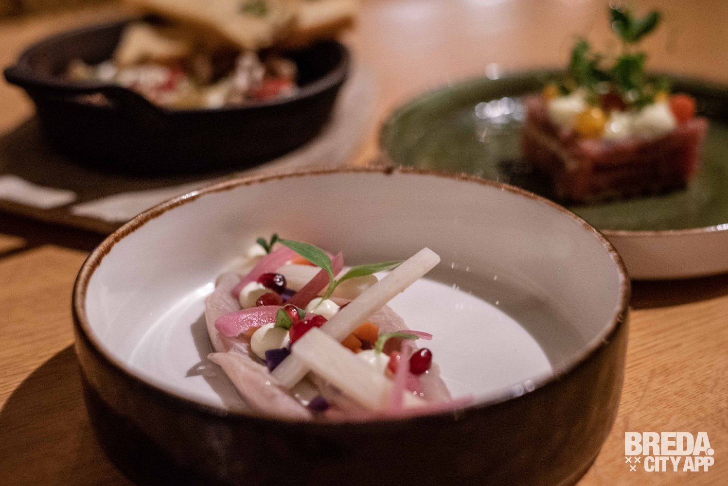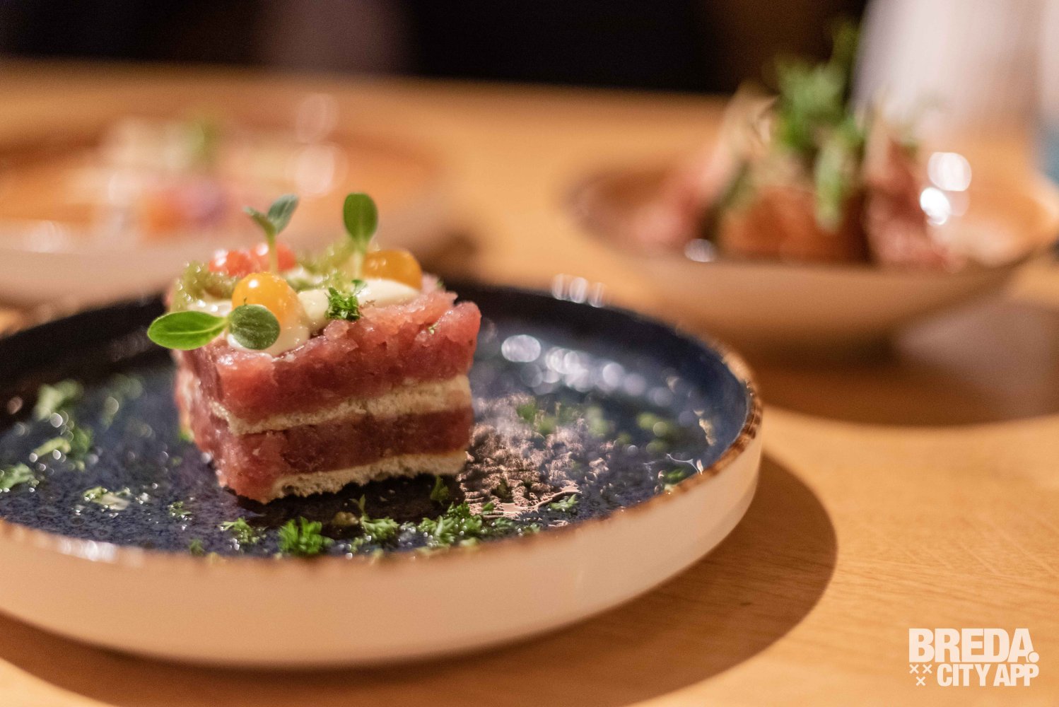 De voorgerechten worden geserveerd: we beginnen met warme lepelkaas met focacciatoast, afgemaakt met lekkere truffelhoning. Daarnaast krijgen we de tonijntartaar en de ceviche van makreel. De tartaar van tonijn met avocado is zacht van smaak, waar de wasabicrème nog dat extra beetje pit toevoegt. Het opgemaakte bord van de ceviche van makreel is werkelijk een feestje om naar te kijken. Samen met de granaatappel, paarse aardappel, palmhart en rode ui vormt het gerecht een mooi en fris geheel.