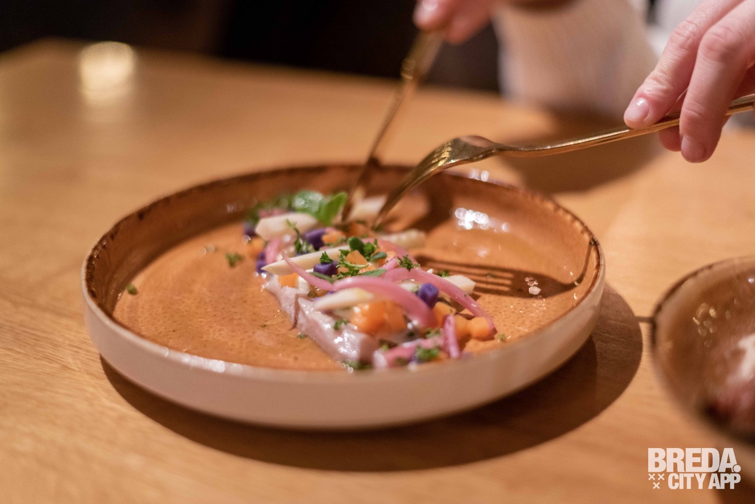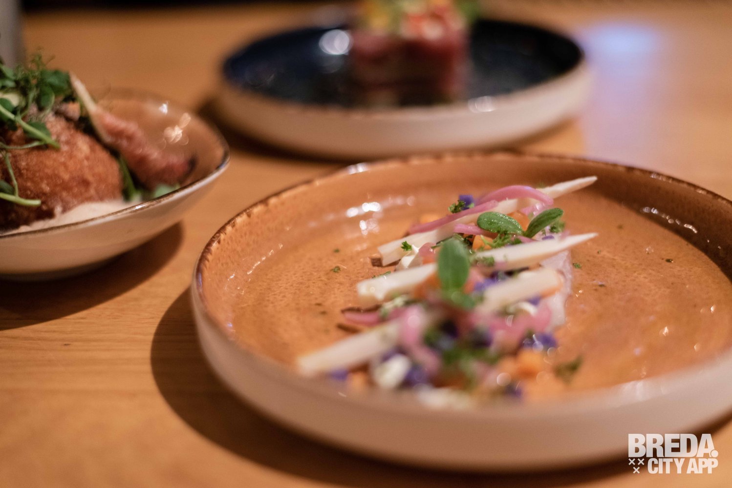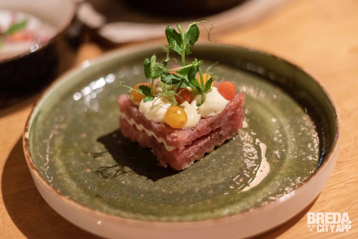 De voorgerechten worden geserveerd: we beginnen met warme lepelkaas met focacciatoast, afgemaakt met lekkere truffelhoning. Daarnaast krijgen we de tonijntartaar en de ceviche van makreel. De tartaar van tonijn met avocado is zacht van smaak, waar de wasabicrème nog dat extra beetje pit toevoegt. Het opgemaakte bord van de ceviche van makreel is werkelijk een feestje om naar te kijken. Samen met de granaatappel, paarse aardappel, palmhart en rode ui vormt het gerecht een mooi en fris geheel.